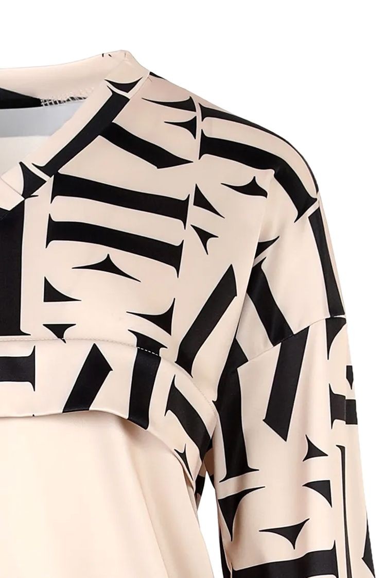 - Η μπλούζα έχει μακριά μανίκια με λάστιχο στο τελείωμα και τριγωνική λαιμόκοψη και το παντελόνι έχει ψηλή μέση και χαλαρή γραμμή.