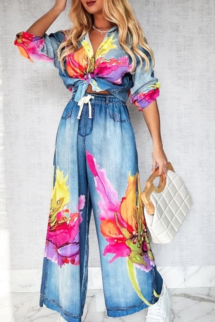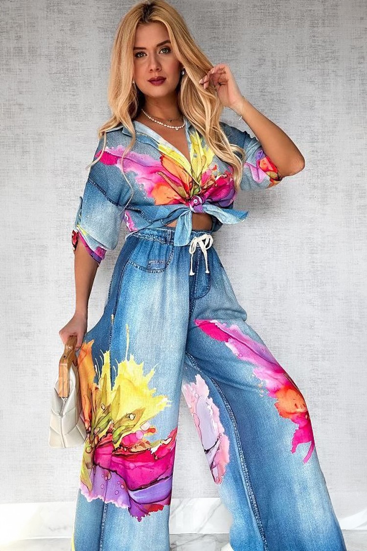 - Ελκυστικό σετ δύο τεμαχίων με πολύχρωμο μοτίβο - παντελόνι και πουκάμισο, κατάλληλο για την καθημερινή ζωή.