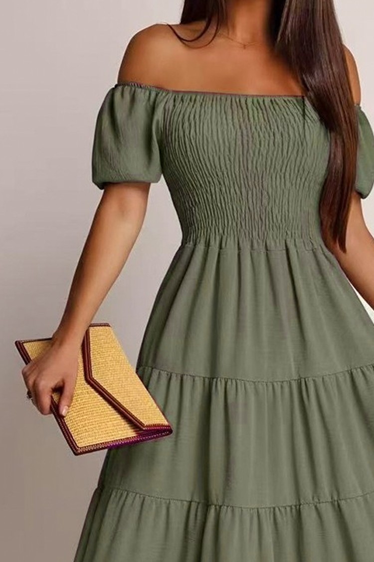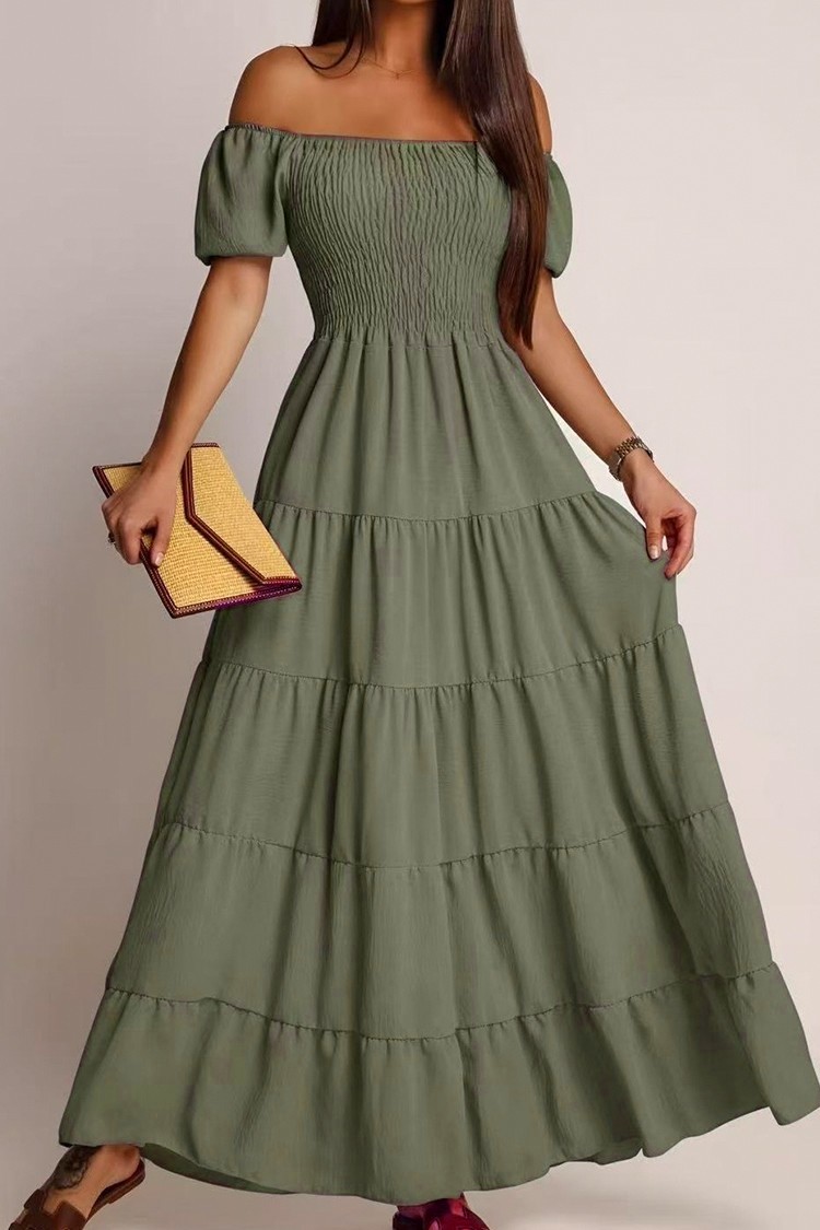 - Το φόρεμα είναι μακρύ, με κοντά, φαρδιά μανίκια και ελαστική μέση.
