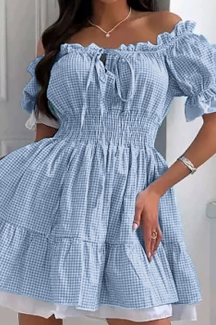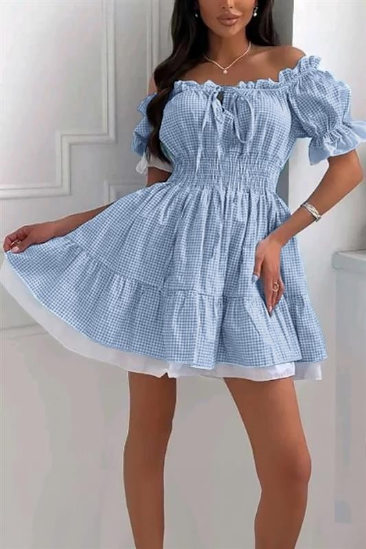 - Κοντό φόρεμα με μοντέρνο σχέδιο σε πολύχρωμο μοτίβο, κατάλληλο για διάφορους συνδυασμούς μόδας.