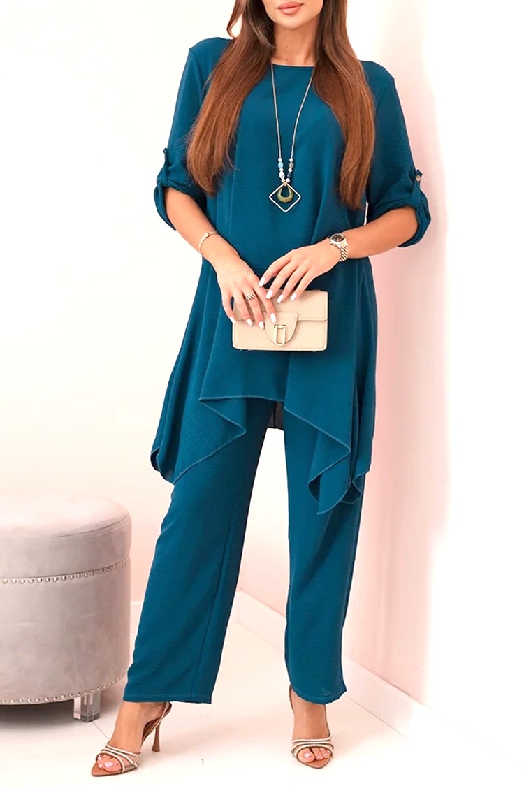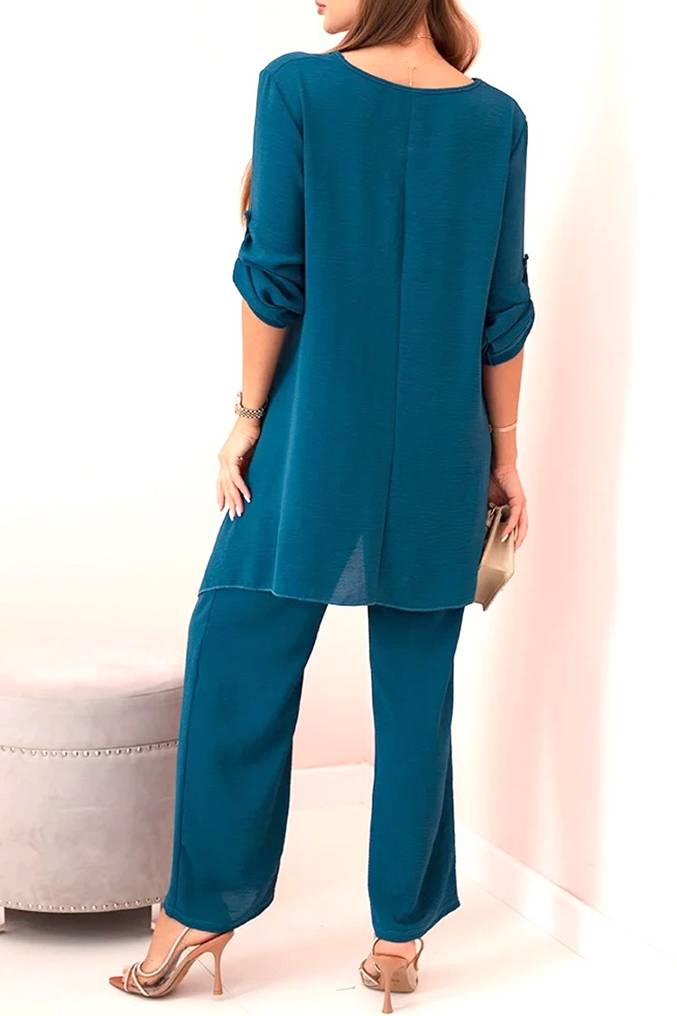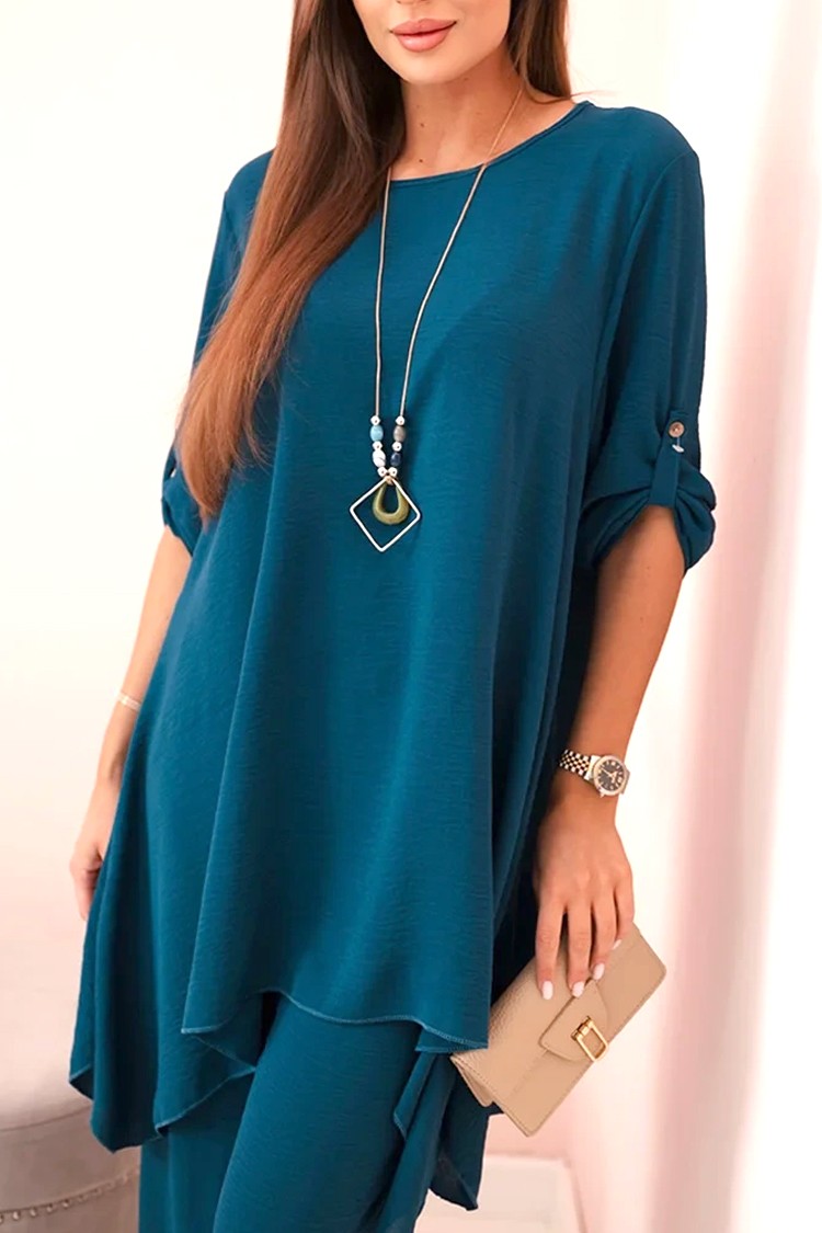 - Κομψό σετ δύο τεμαχίων - άνετο παντελόνι και μπλούζα με εντυπωσιακό κολιέ, εξαιρετικά κατάλληλο για την καθημερινότητα.