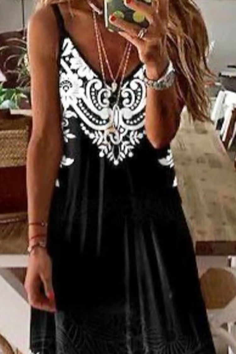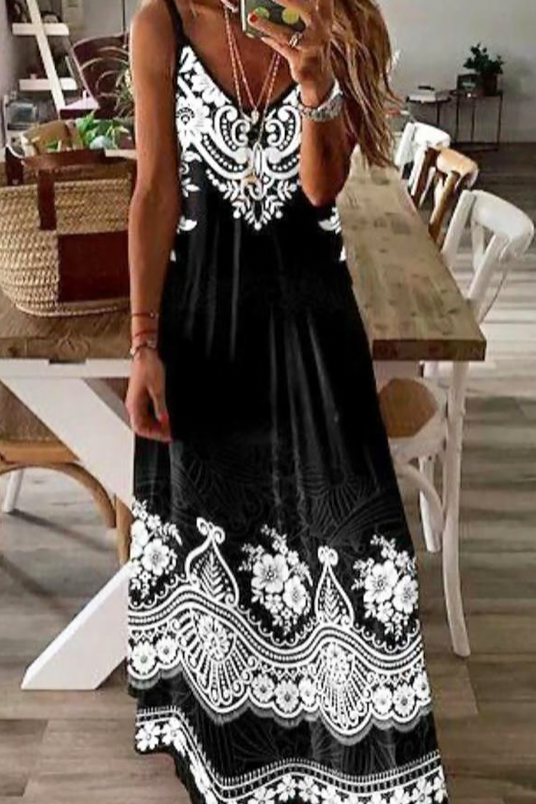 - Το φόρεμα έχει άνετη και ελεύθερη γραμμή, μακρύ μήκος και ελκυστικό πολύχρωμο μοτίβο.