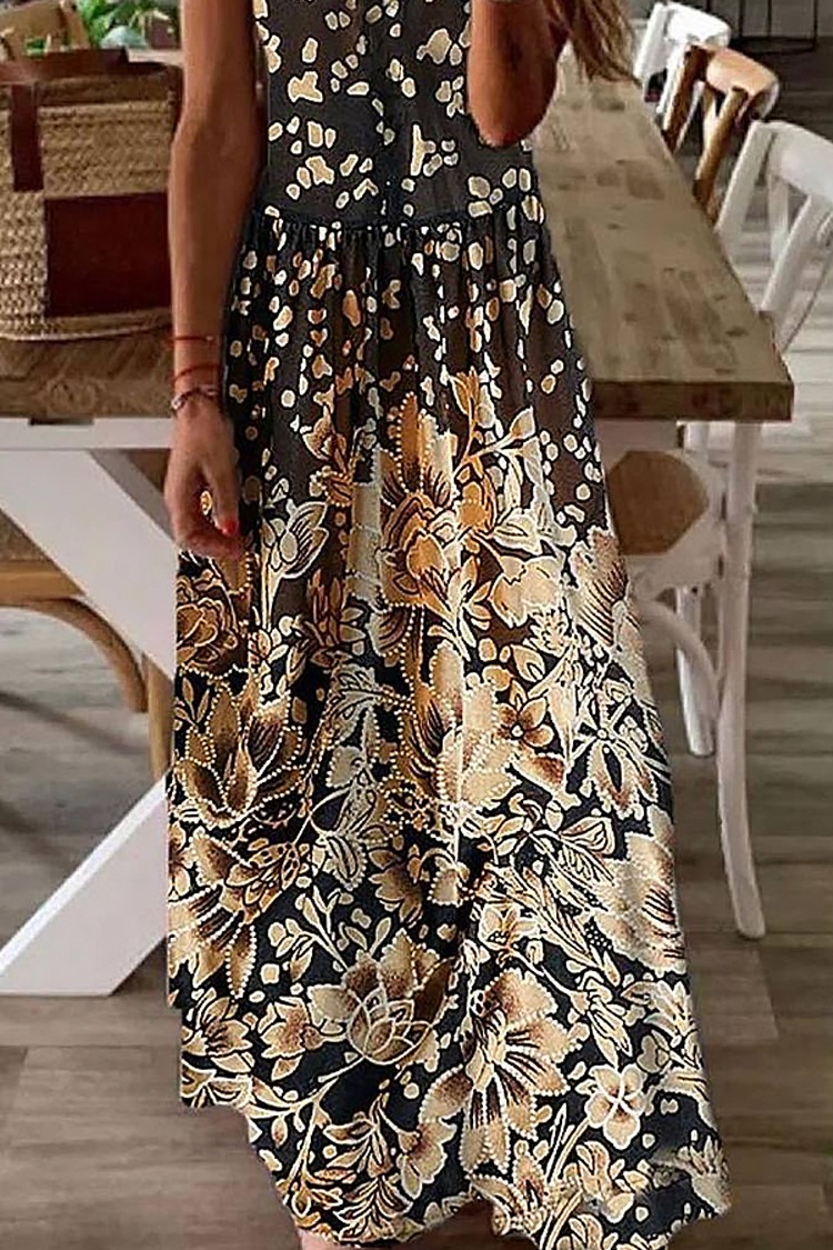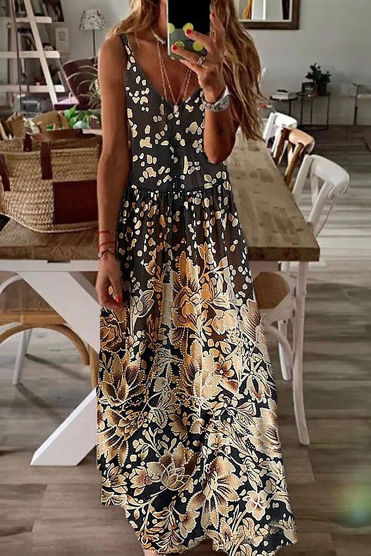 - Το φόρεμα έχει άνετη και ελεύθερη γραμμή, μακρύ μήκος και ελκυστικό πολύχρωμο μοτίβο.