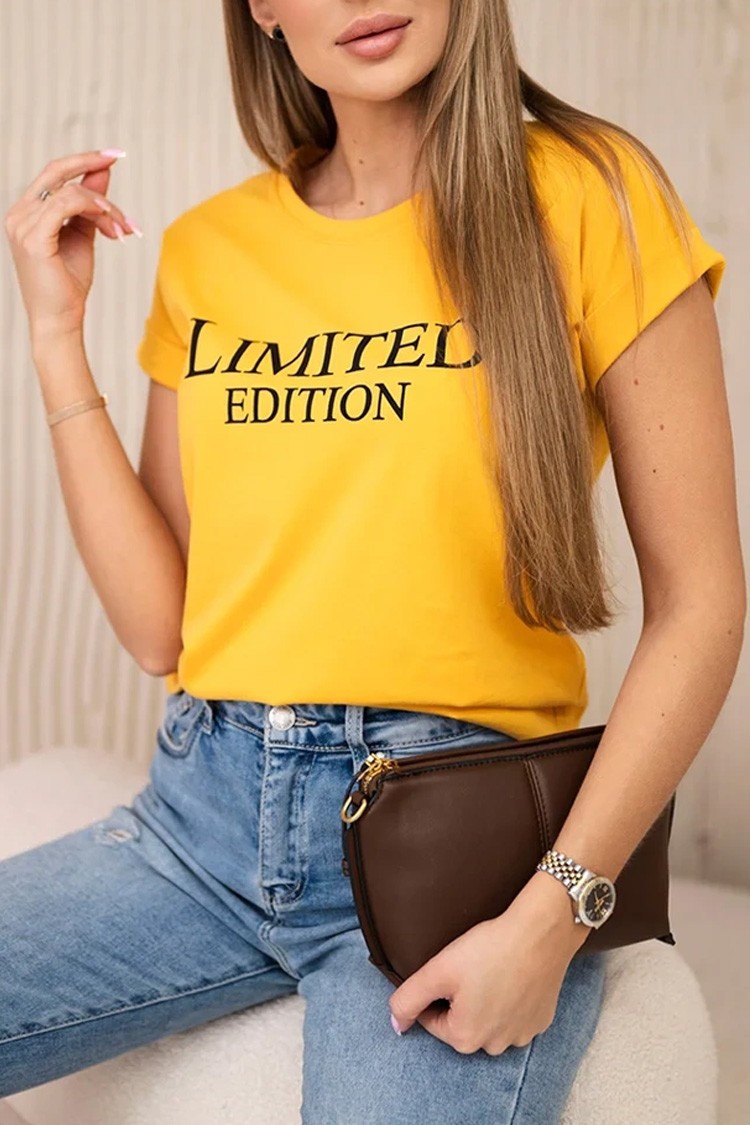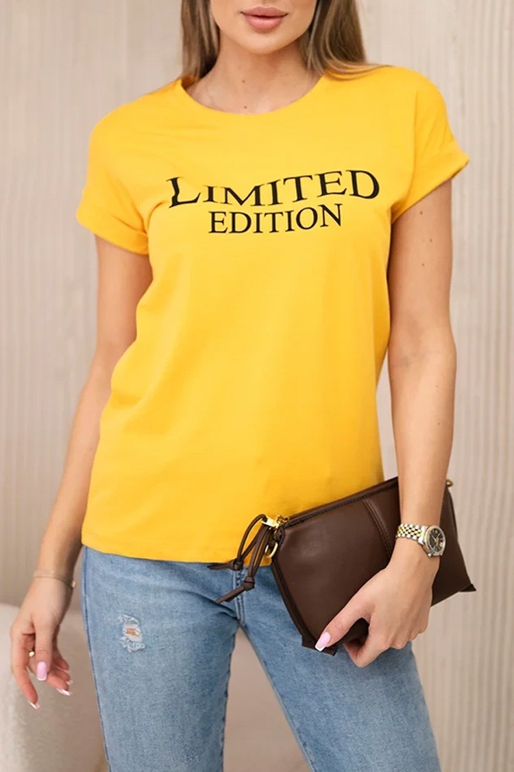 - Πρακτικό γυναικείο μπλουζάκι με στρογγυλή λαιμόκοψη και εντυπωσιακή επιγραφή, μια εξαιρετική επιλογή για μια όμορφη εμφάνιση.