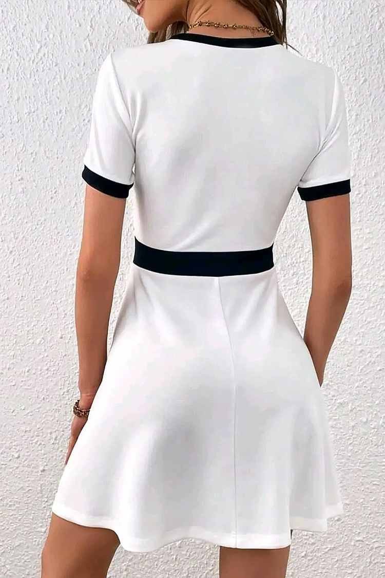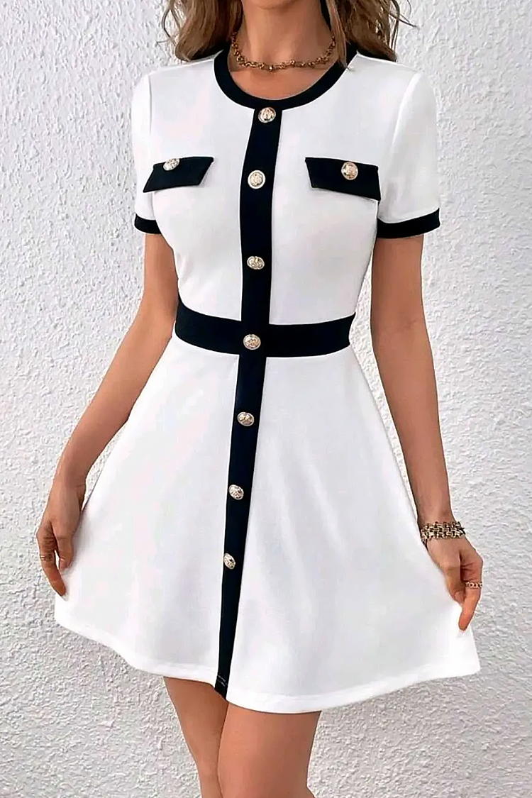 - Δημιουργήστε μια κομψή εμφάνιση με αυτό το κοντό φόρεμα σε κλασικά χρώματα, κατάλληλο για την καθημερινότητα και το γραφείο.