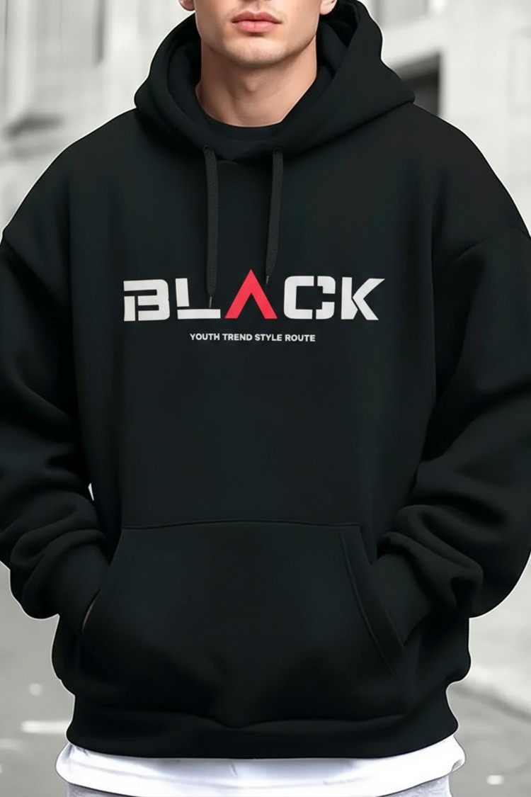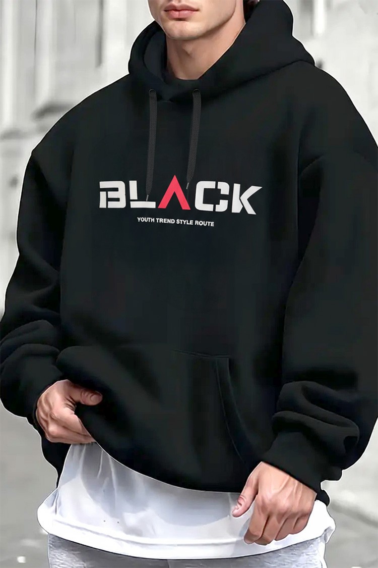 - Πρακτικό ανδρικό φούτερ με στάμπα σε μαύρο χρώμα, κατάλληλο για διάφορους συνδυασμούς.