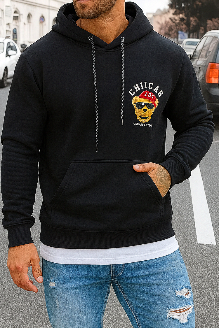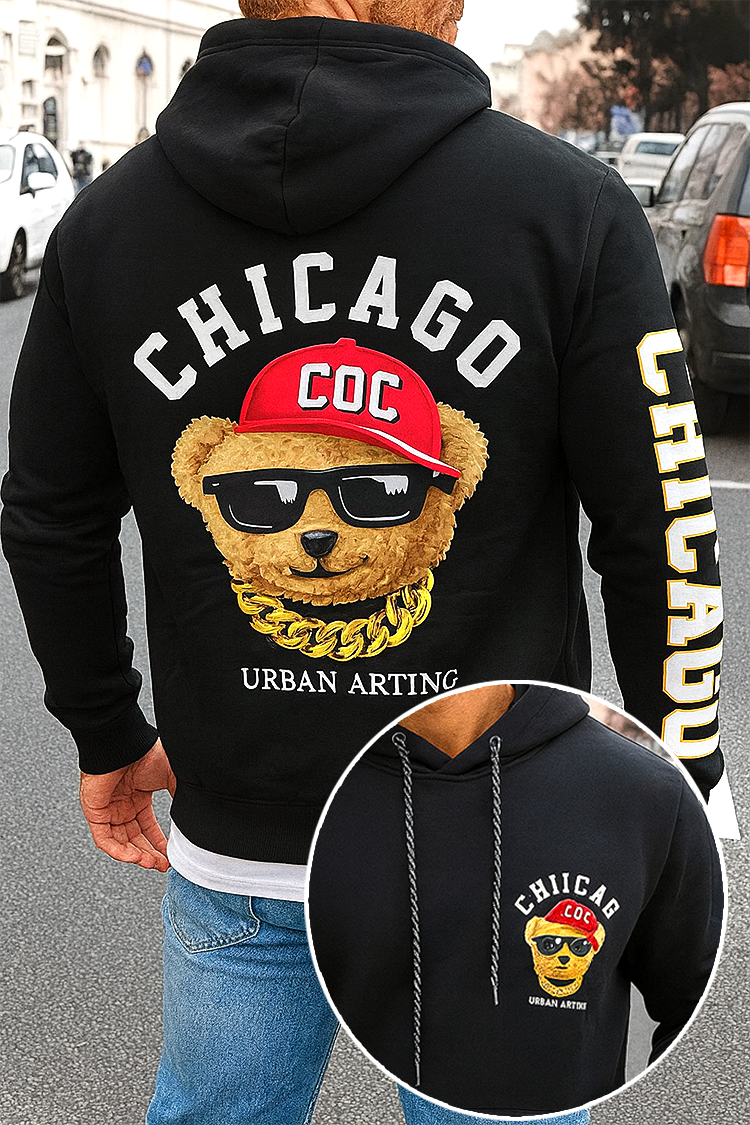 - Το μαύρο φόντο τονίζει την εντυπωσιακή στάμπα στην πλάτη – Λεπτομερής εικονογράφηση με αρκουδάκι, συμπληρωμένη με μεγάλη επιγραφή CHICAGO σε εντυπωσιακή γραμματοσειρά..