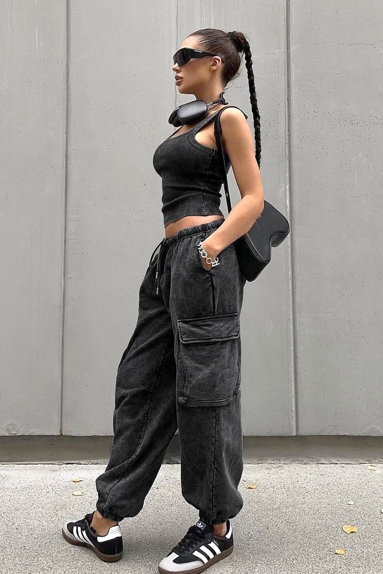 - Το παντελόνι έχει τσέπες, κλασικό φούτερ και τοπ με σέξι στρόγγυλη λαιμόκοψη.
