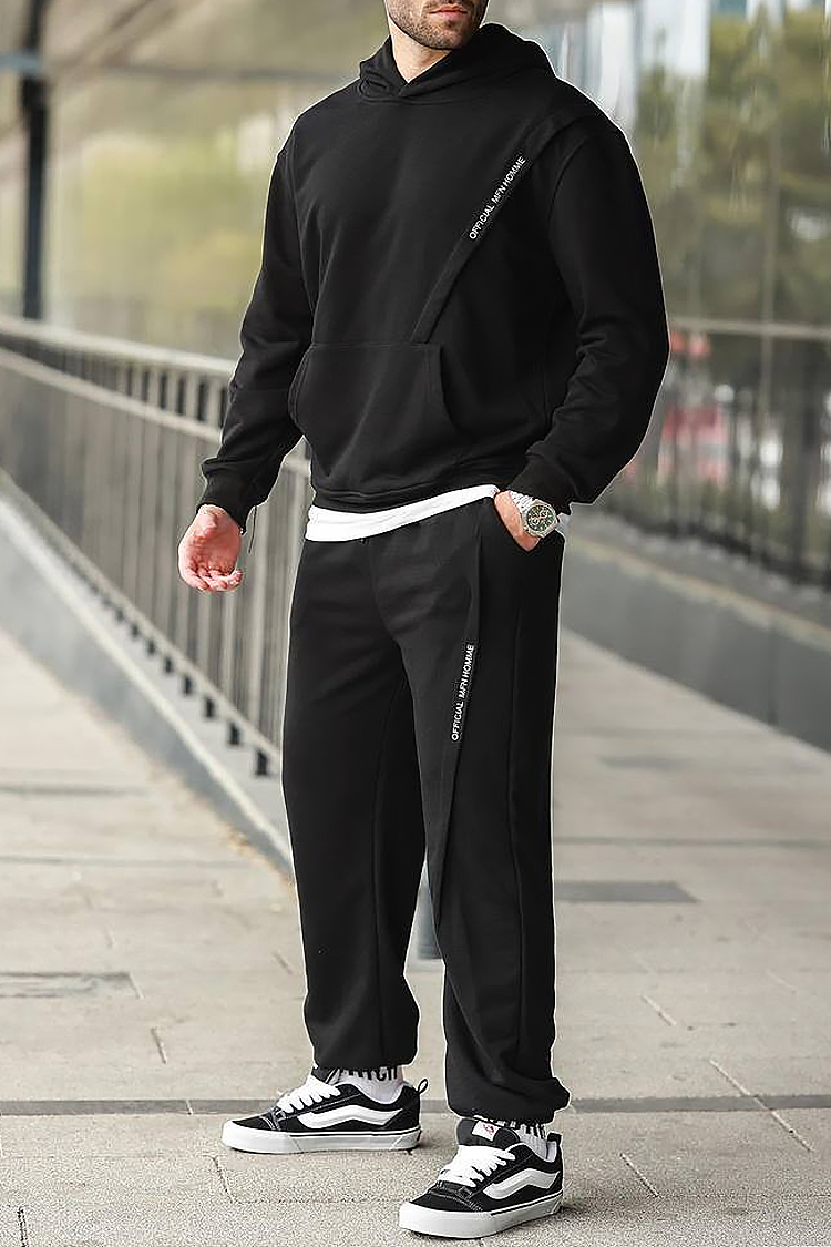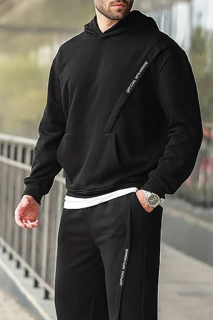 - Ανδρικό σπορ-κομψο σετ δύο τεμαχίων, που περιλαμβάνει φούτερ με κουκούλα και αθλητικό παντελόνι.