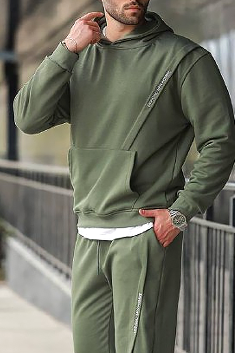 - Ανδρικό σπορ-κομψο σετ δύο τεμαχίων, που περιλαμβάνει φούτερ με κουκούλα και αθλητικό παντελόνι.