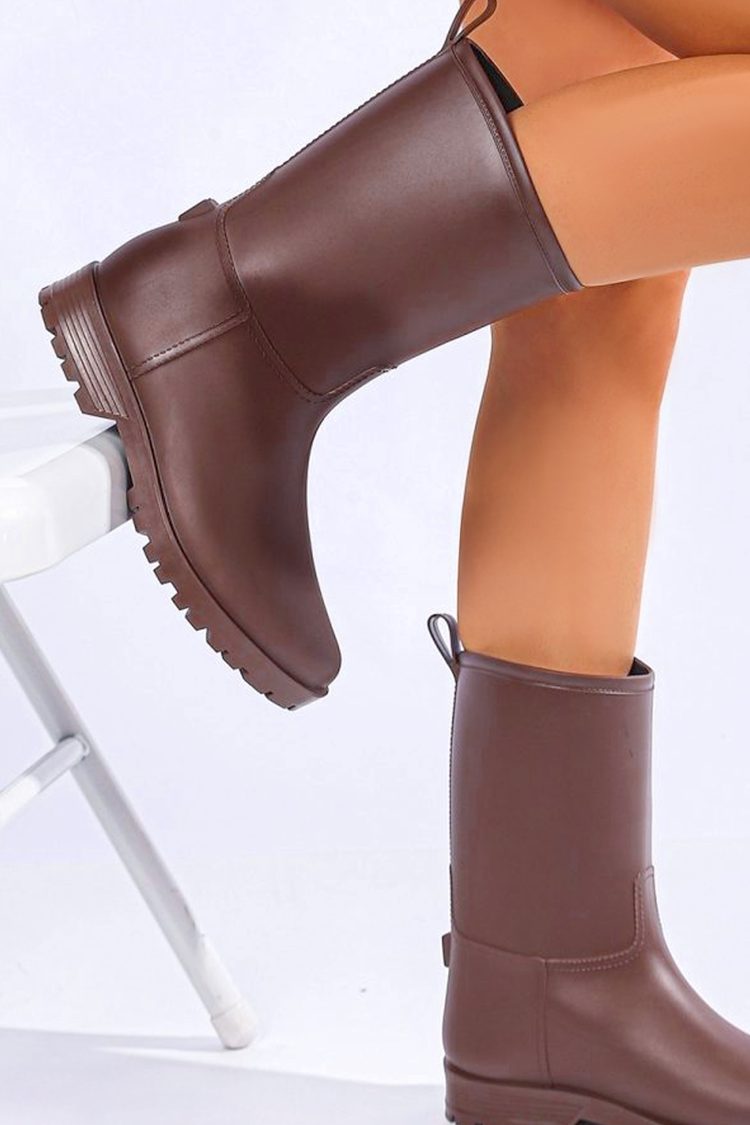 - Μοντέρνο μοντέλο γυναικείες μπότες από καουτσούκ σε κλασικό χρώμα.