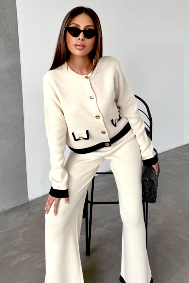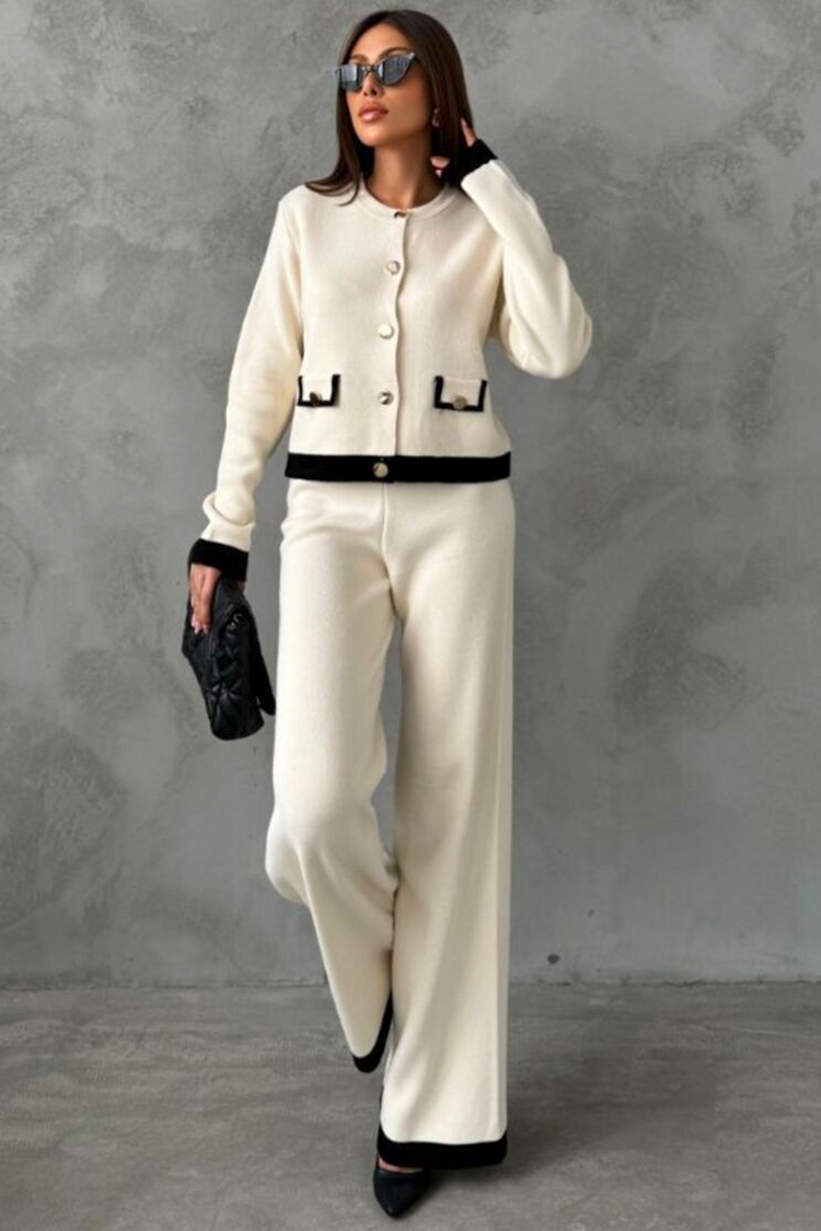 - Το παντελόνι έχει ψηλή μέση και ελεύθερη γραμμή, ενώ η ζακέτα έχει κουμπιά και εντυπωσιακές τσέπες.