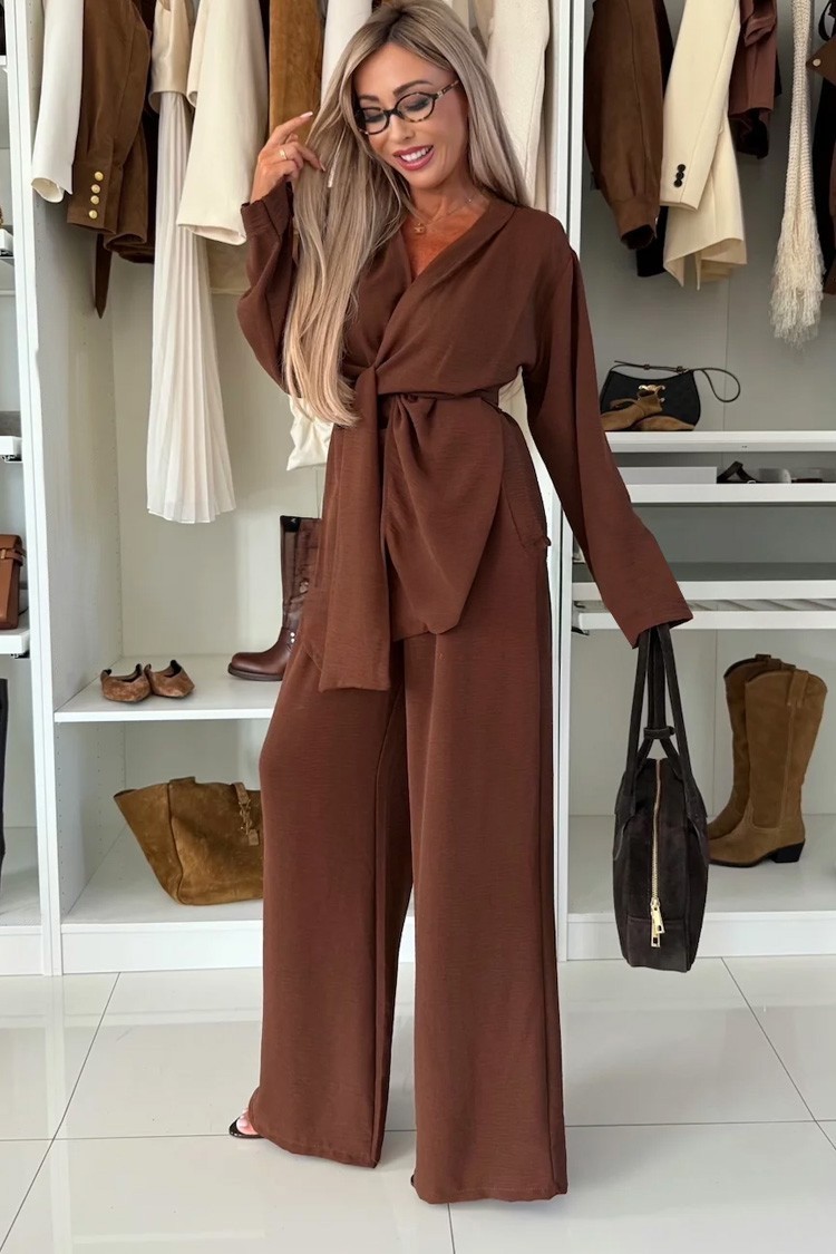 - Το σετ έχει ελεύθερη γραμμή. Το πάνω μέρος είναι ένα πανοδορι με ζώνη, ενώ το παντελόνι έχει ίσια μπατζάκια.