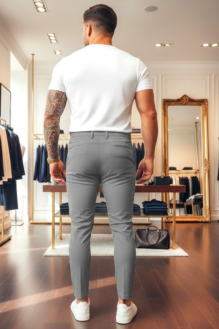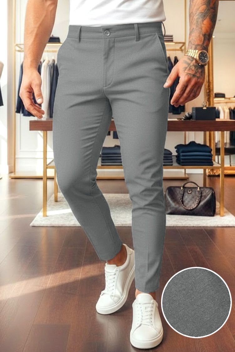 - Σπορ-κομψό ανδρικό παντελόνι σε γκρι χρώμα με καθαρό σχέδιο, τσέπες και ίσια μπατζάκια, με το οποίο θα τραβήξετε όλα τα βλέμματα.