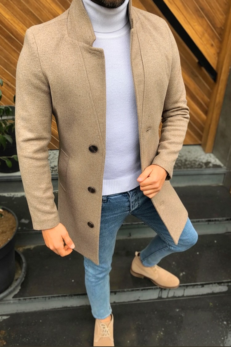 - Κομψό ανδρικό παλτό με ίσια γραμμή και απλό σχέδιο σε μπεζ χρώμα.