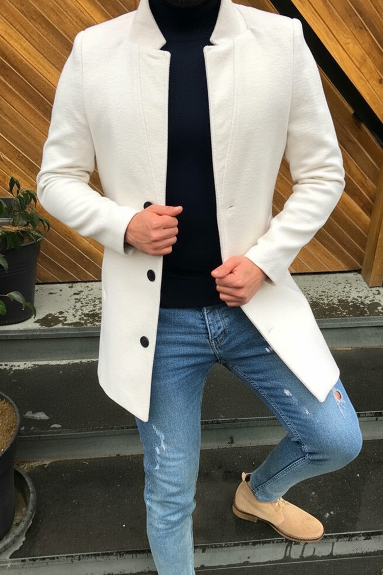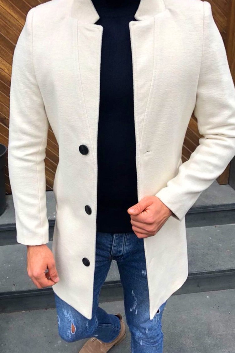 - Κομψό ανδρικό παλτό με ίσια γραμμή και απλό σχέδιο σε εκρού χρώμα.
