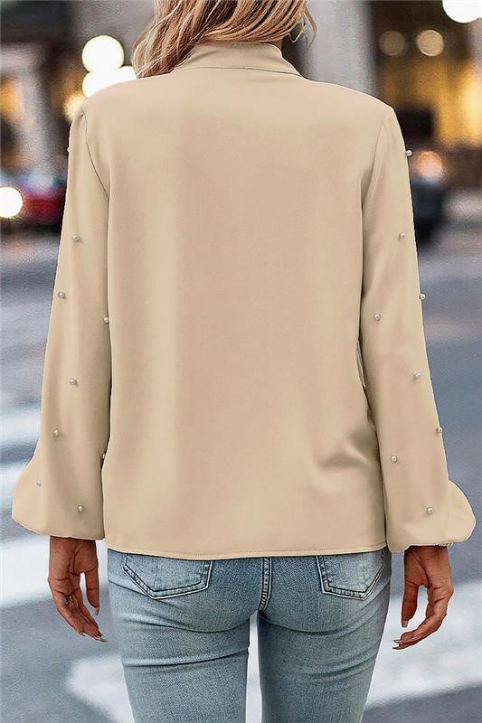 - Το μοντέλο έχει άνετη γραμμή, μακριά μανίκια και εντυπωσιακή λαιμόκοψη με πέτρες σε όλο το μήκος.