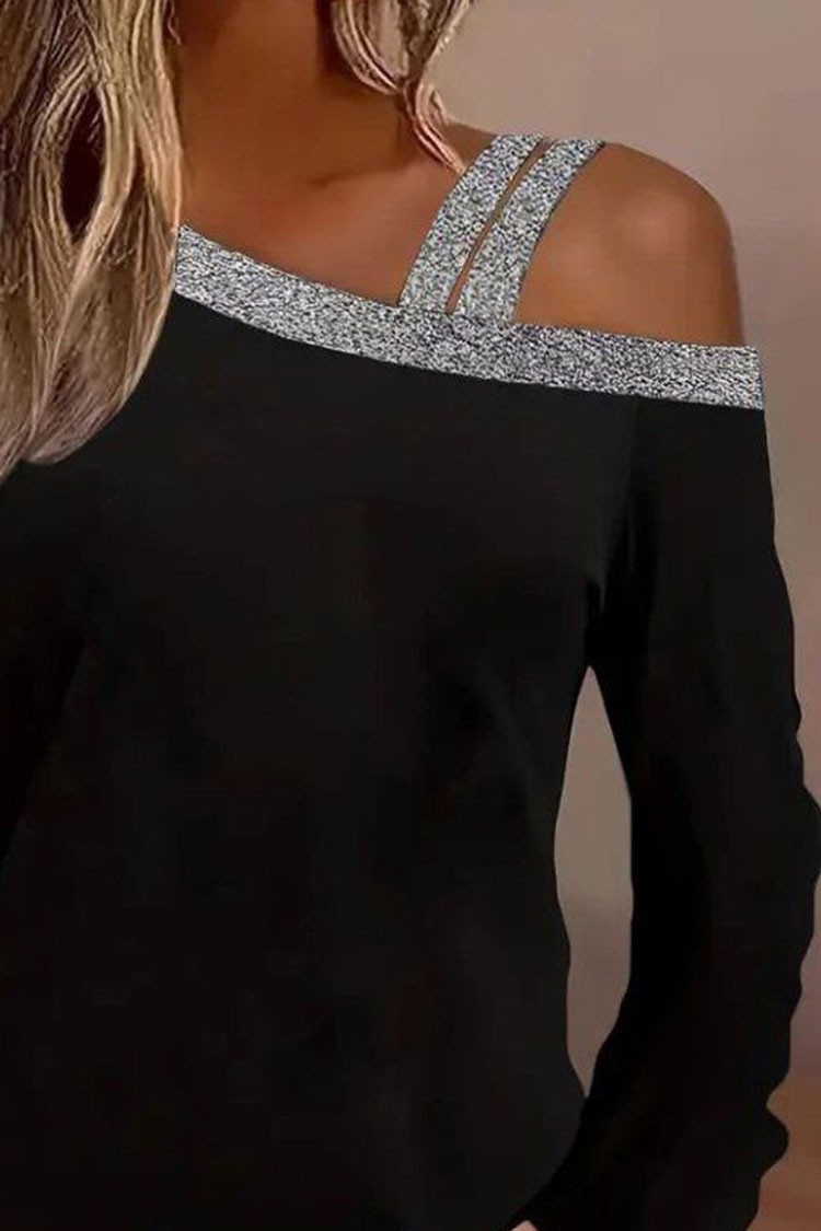 - Το μοντέλο έχει άνετη γραμμή, μακριά μανίκια και ένα γυμνό ώμο.