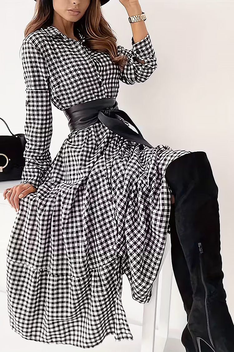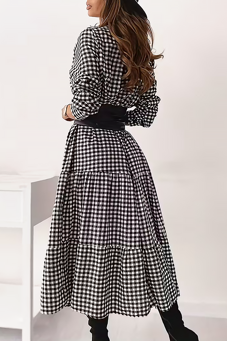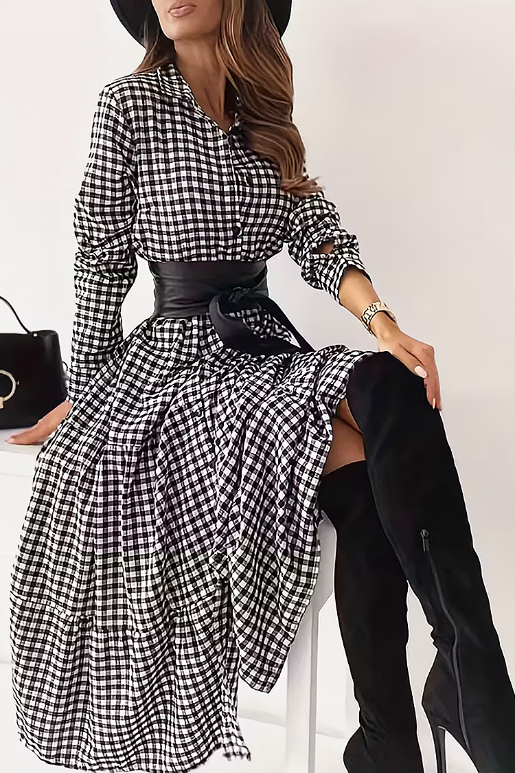 - Επιλέξτε αυτό το midi φόρεμα, τύπου πουκάμισο, με καρό σχέδιο, ιδανικό για την καθημερινή σας εμφάνιση.