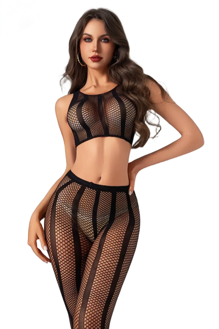 - Ερωτικό σετ, αποτελούμενο από δύο κομμάτια, κολάν και τοπ με εφαρμοστή γραμμή και λεπτό δίχτυ.