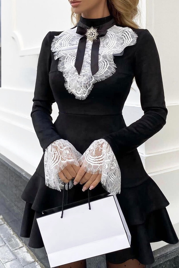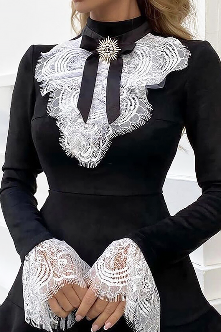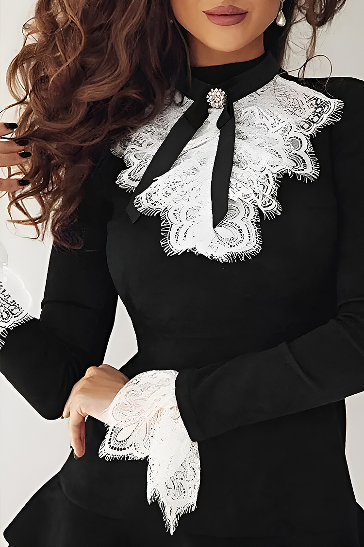 - Όμορφο στοιχείο είναι η αντίθεση της δαντέλας στην λαιμόκοψη και τα μανίκια και η στυλάτη καρφίτσα.
