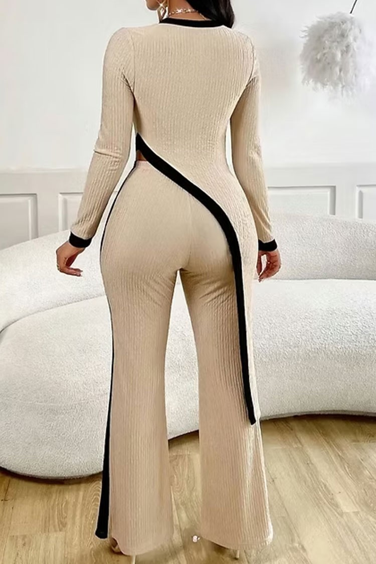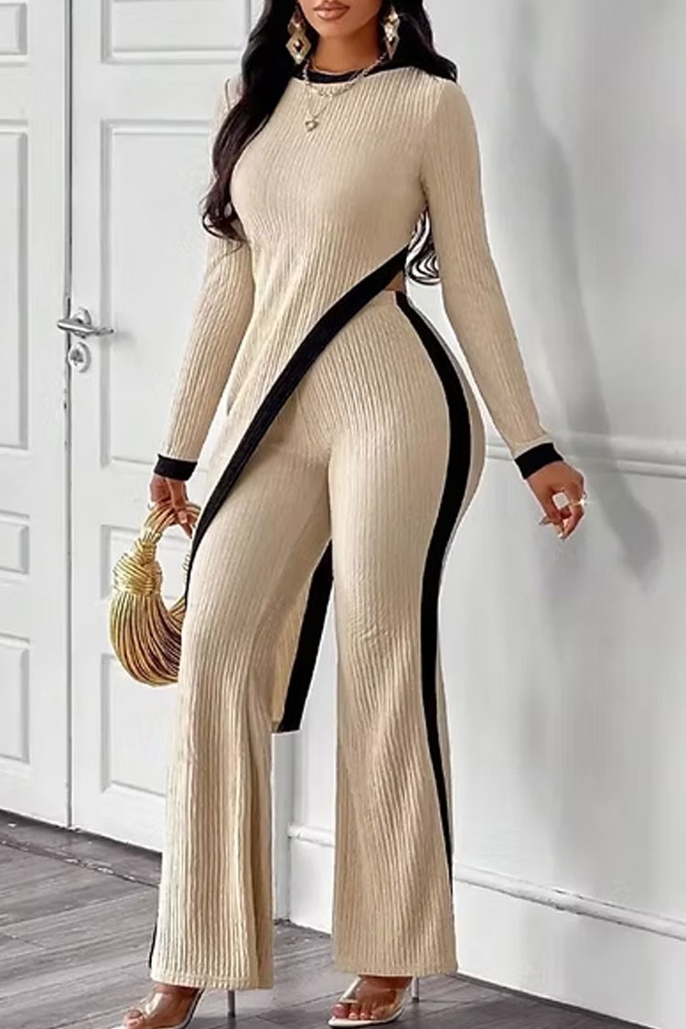 - Η μπλούζα έχει μακριά μανίκια και ασύμμετρη γραμμή, ενώ το παντελόνι έχει εφαρμοστή γραμμή και ψηλή ελαστική μέση.