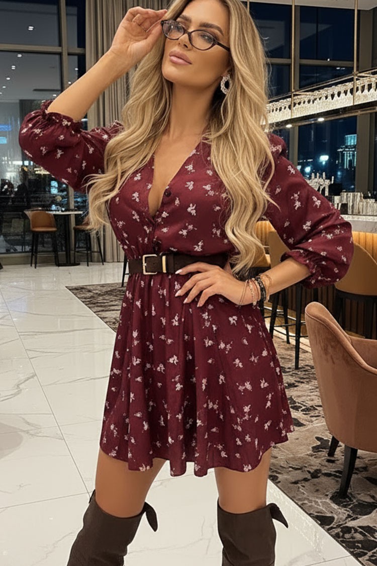 - Το φόρεμα έχει μακριά μανίκια και ελκυστικό floral μοτίβο.
