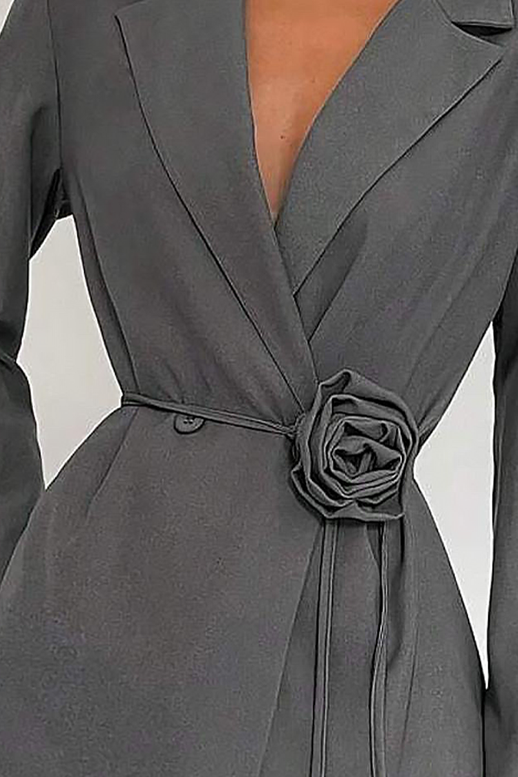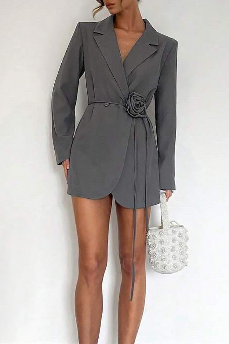 - Το φόρεμα είναι κοντό, με κλασικό γιακά και εντυπωσιακή ζώνη με διακοσμητικό λουλούδι.