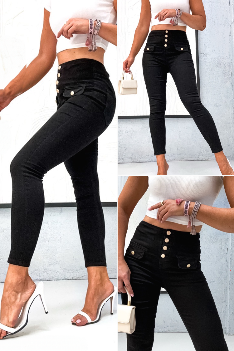 - Το μοντέλο έχει ψηλή μέση, εφαρμοστή γραμμή και εντυπωσιακά κουμπιά μπροστά.