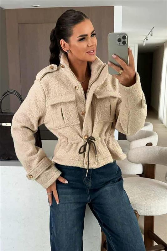- Το μπουφάν έχει άνετη γραμμή, κορδόνια στη μέση και κλείσιμο με φερμουάρ.