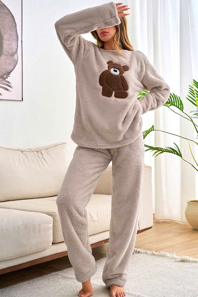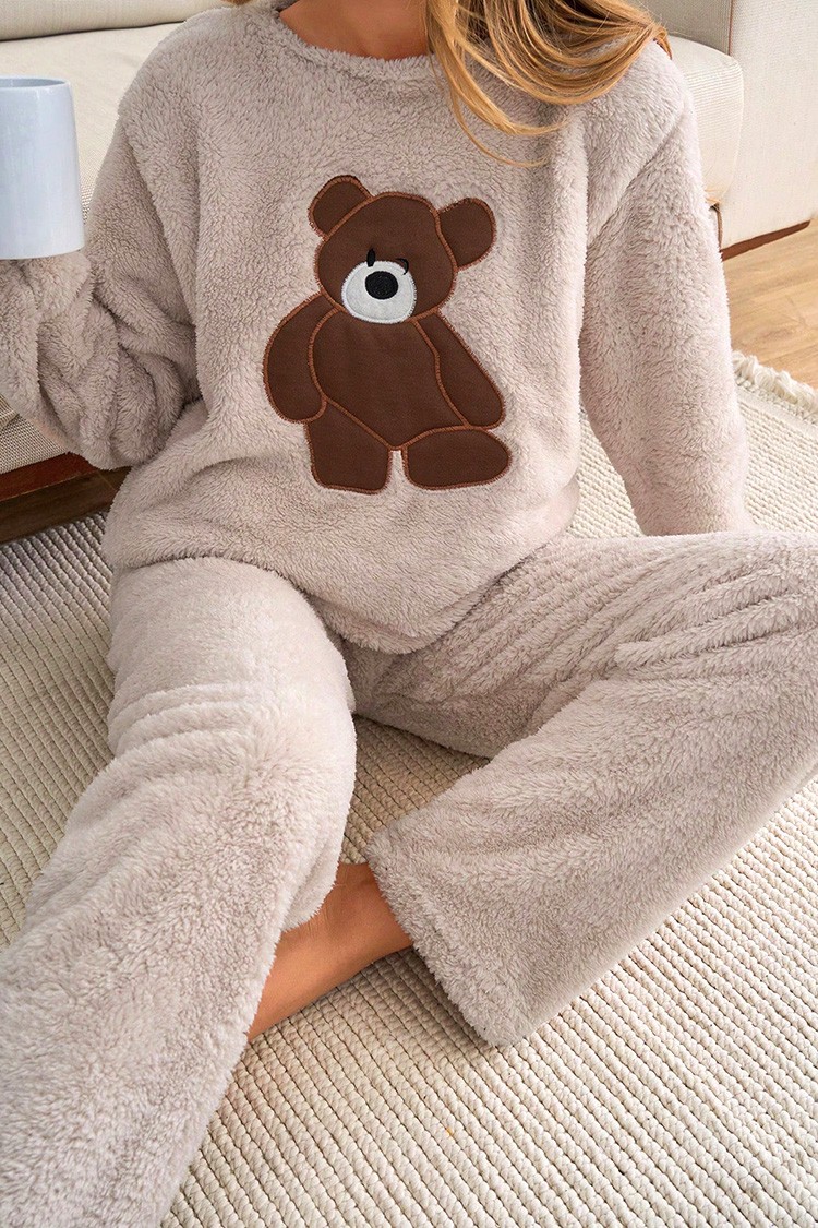 - Η μπλούζα έχει εντυπωσιακό σχέδιο με αρκούδα, ενώ το παντελόνι έχει ψηλή μέση και ελεύθερη γραμμή.