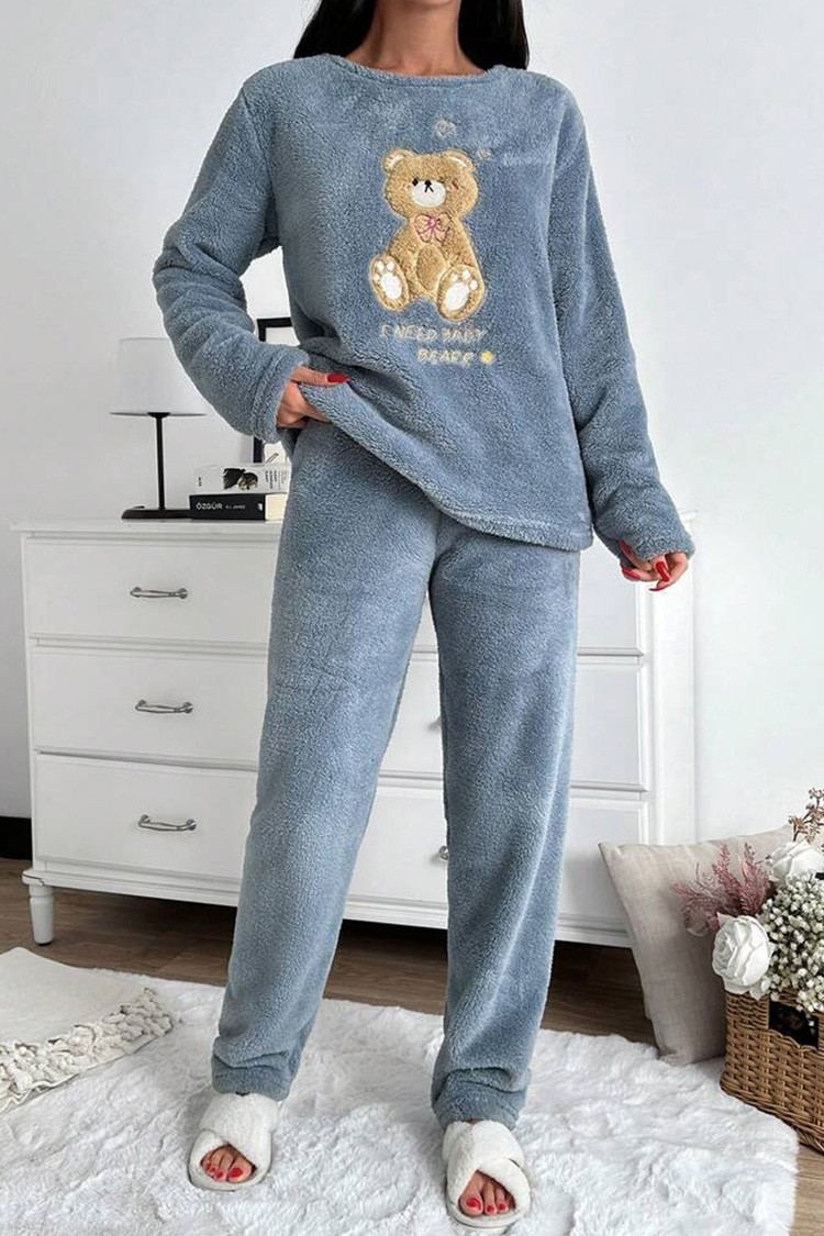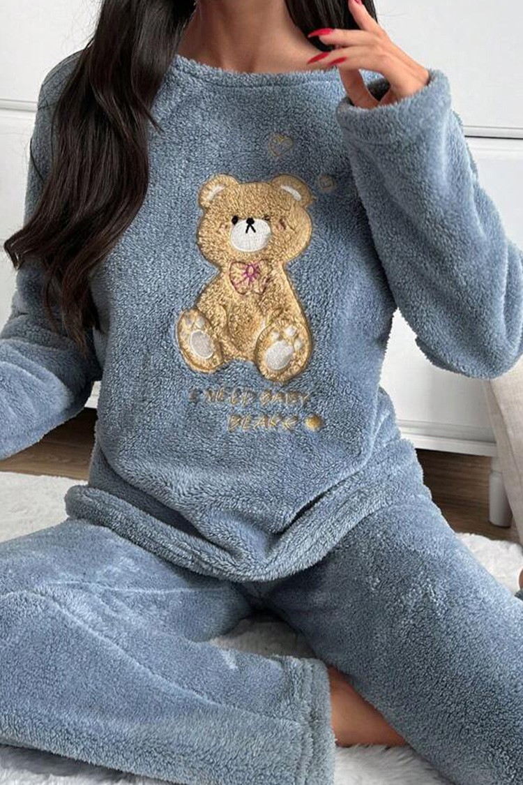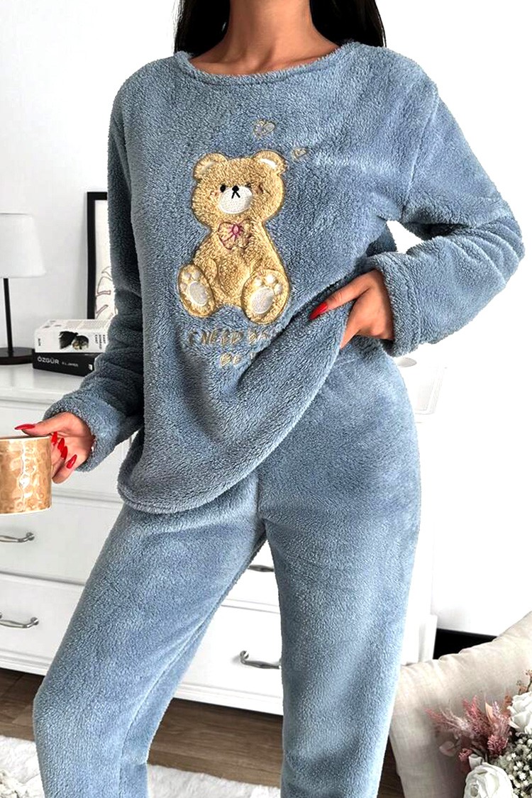 - Η μπλούζα έχει εντυπωσιακό σχέδιο με αρκούδα, ενώ το παντελόνι έχει ψηλή μέση και ελεύθερη γραμμή.