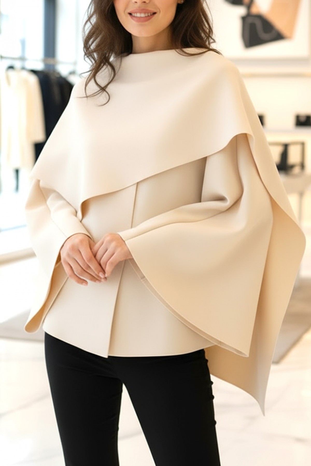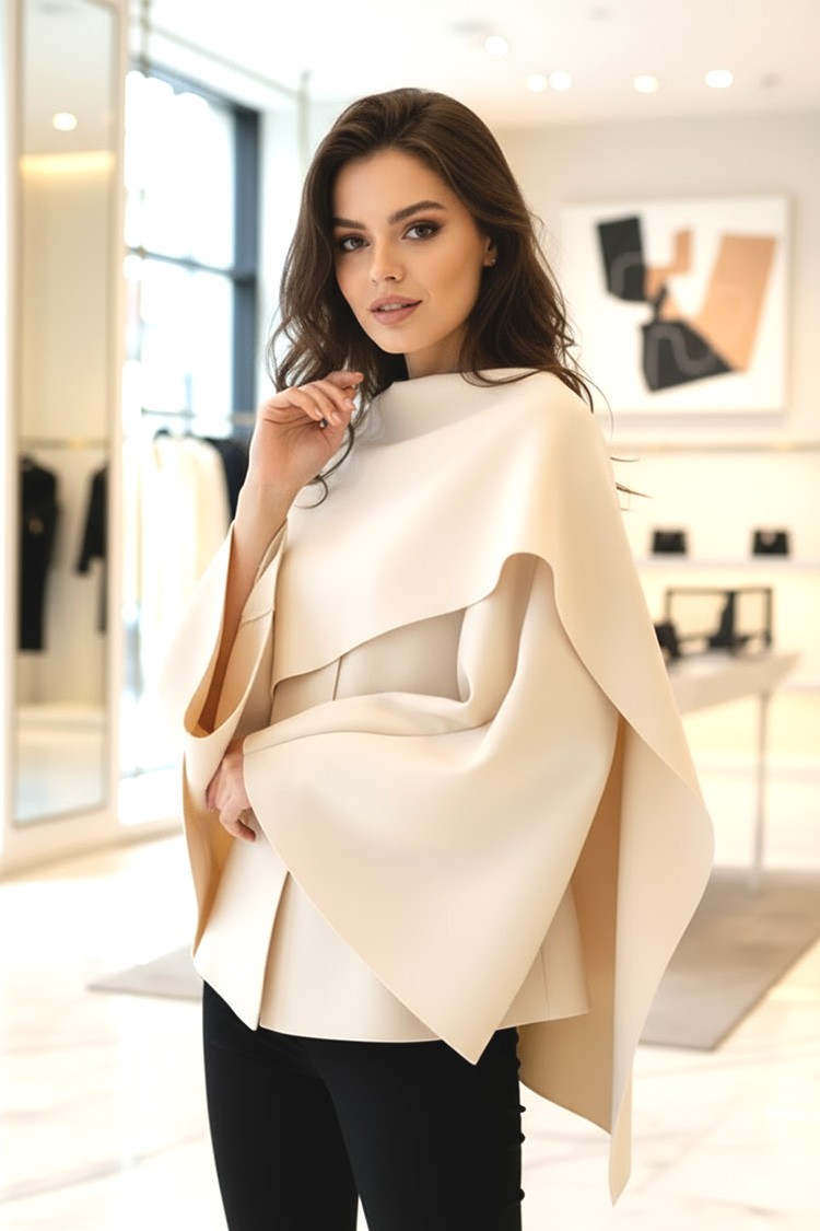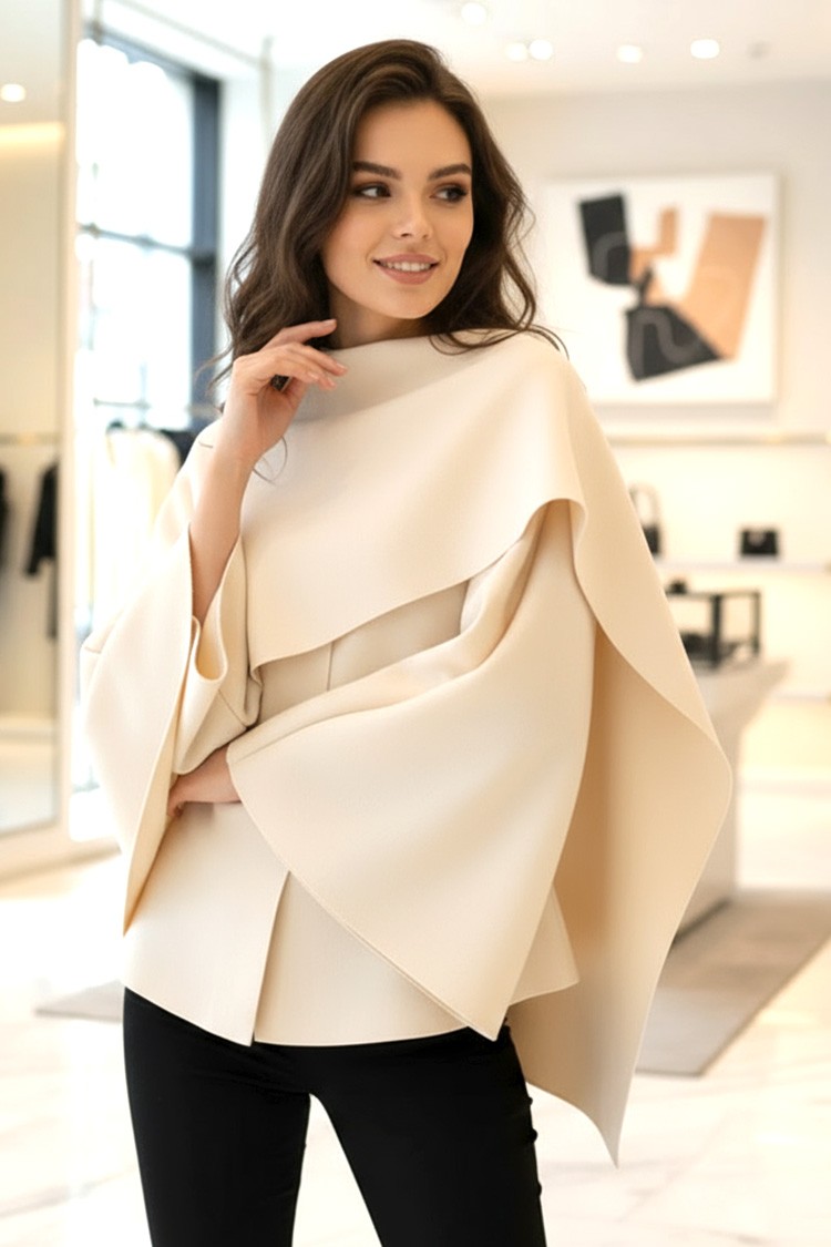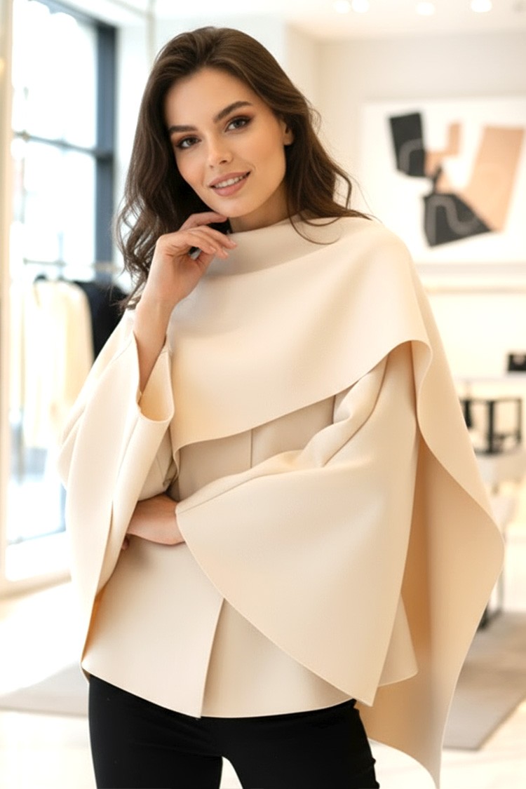 - Το μοντέλο έχει ασύμμετρη γραμμή, φαρδιά εντυπωσιακά μανίκια και χρώμα εκρού.