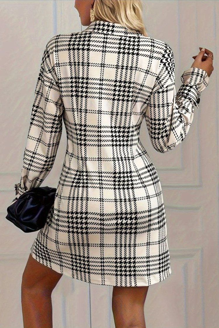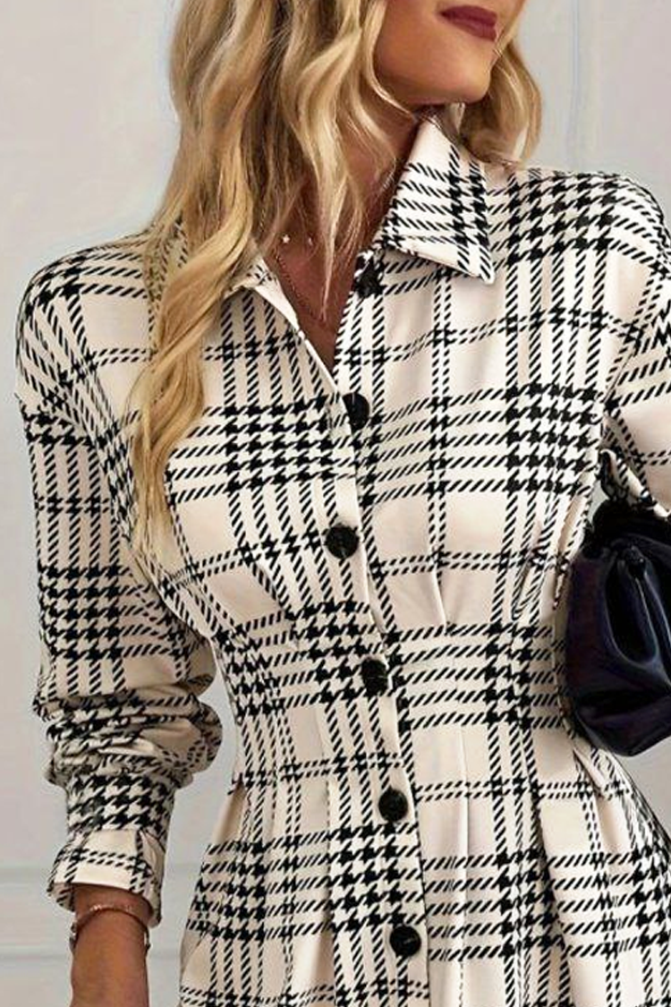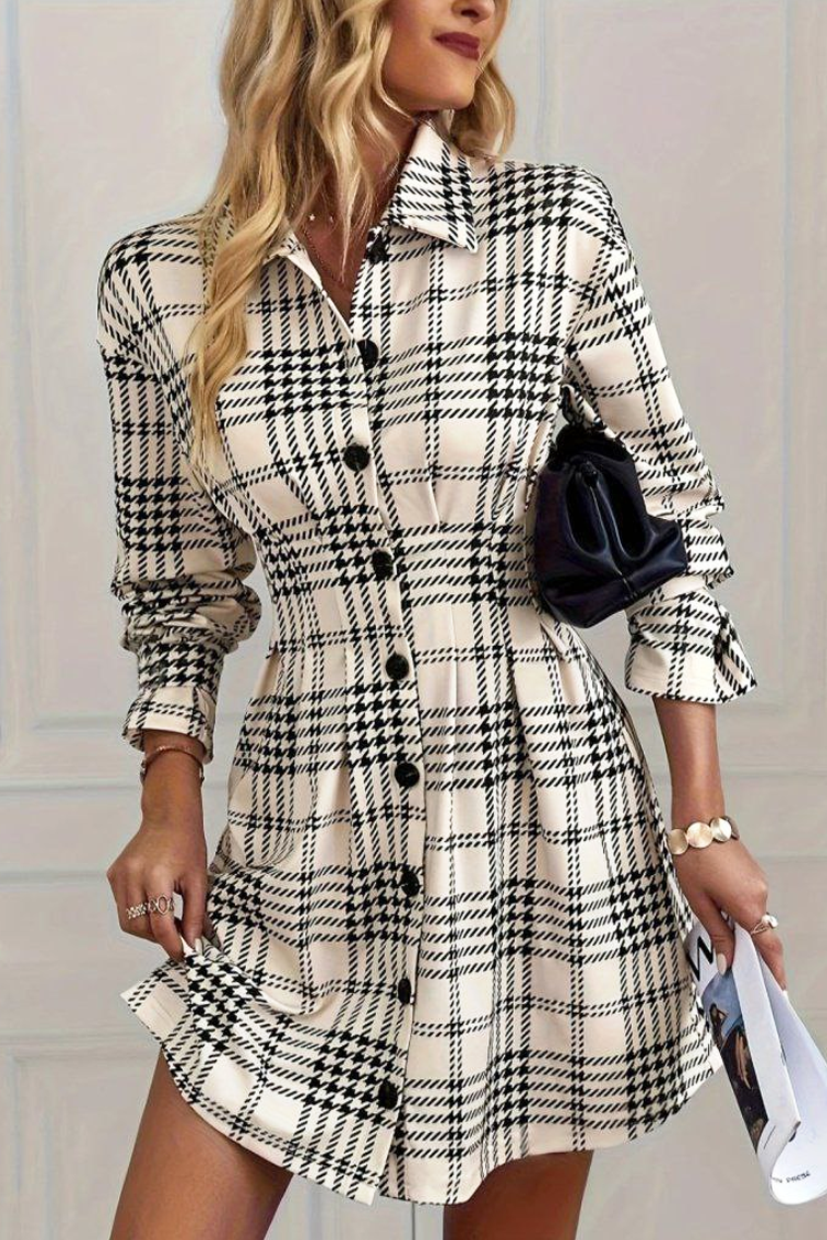 - Το φόρεμα είναι κοντό, με κομψό γιακά, εντυπωσιακό σχέδιο, κουμπιά σε όλο το μήκος και μακριά μανίκια.