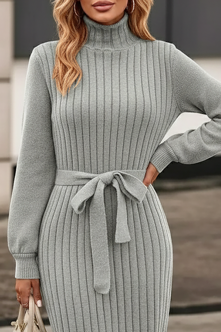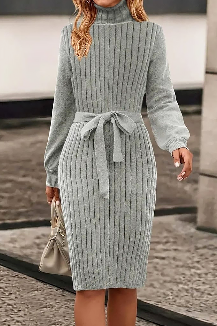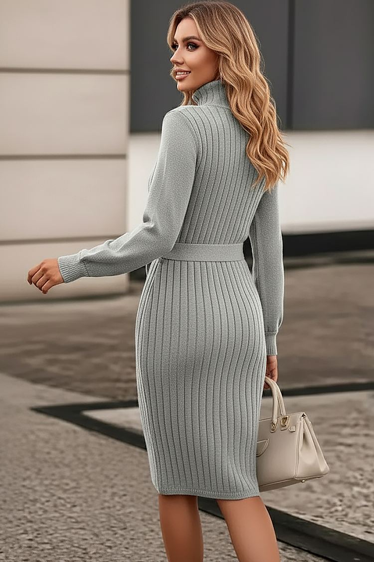 - Το φόρεμα έχει εφαρμοστή γραμμή, μακριά μανίκια, ζώνη από το ίδιο ύφασμα και γιακά.