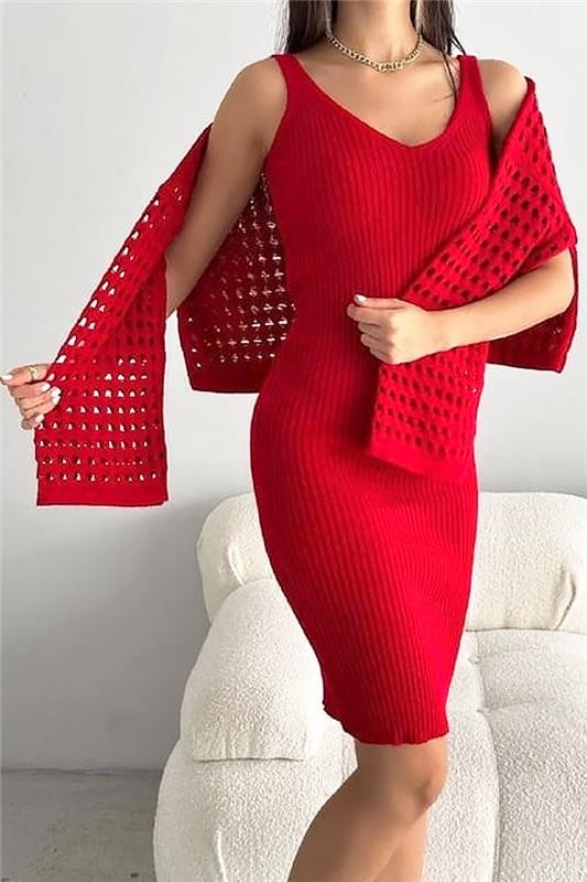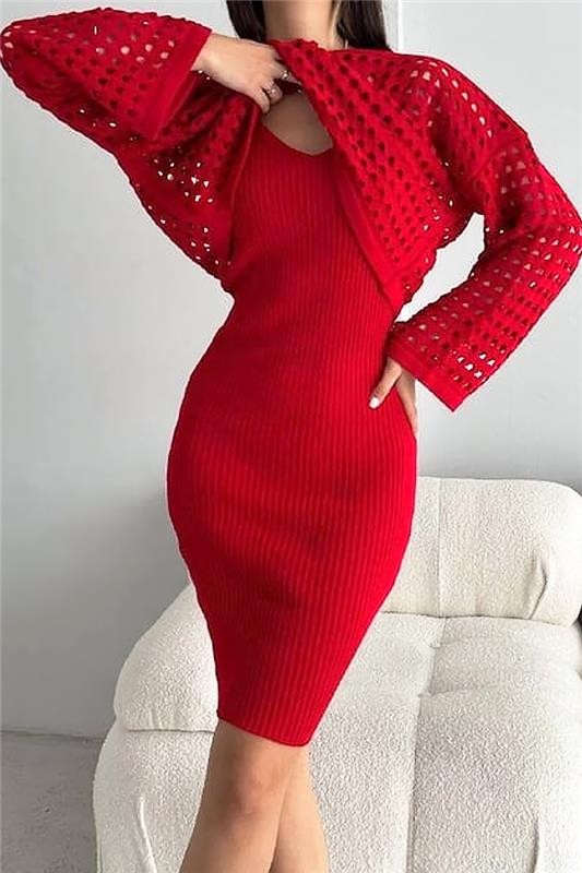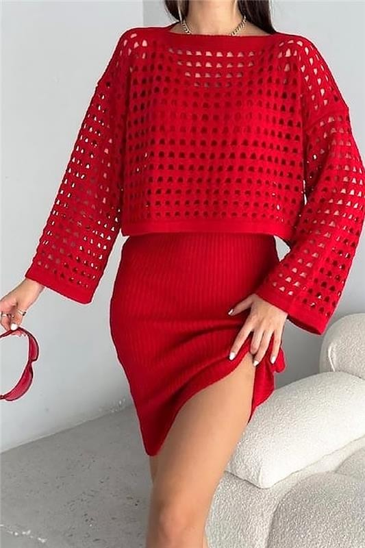 - Γυναικείο σετ δύο τεμαχίων, που αποτελείται από ένα κοντό φόρεμα και ένα εντυπωσιακό πουλόβερ, κατάλληλο για μοντέρνα εμφανίσεις.