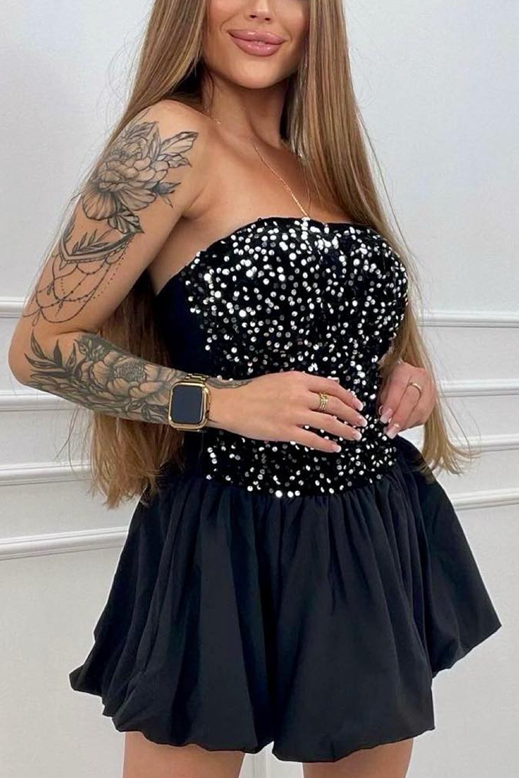 - Το φόρεμα είναι κοντό και έχει εντυπωσιακό πάνω μέρος, διακοσμημένο με παγιέτες.