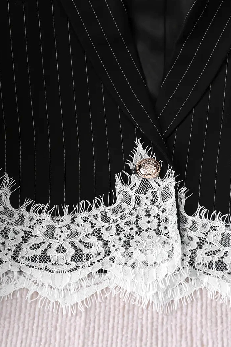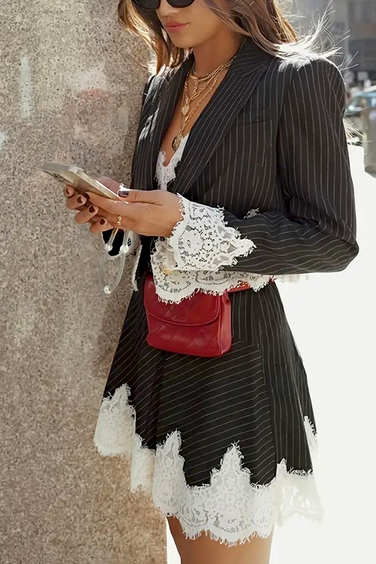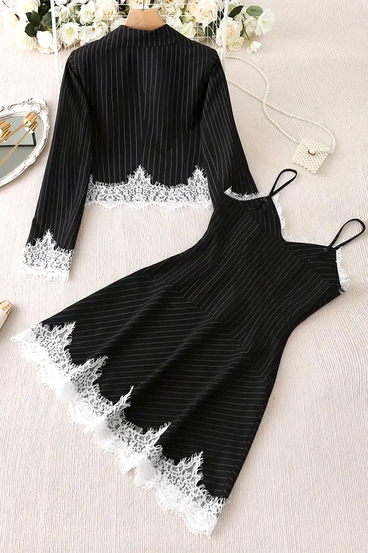 - Ελκυστικό σετ δύο τεμαχίων, που αποτελείται από φόρεμα και σακάκι με δαντέλα και ριγέ σχέδιο.