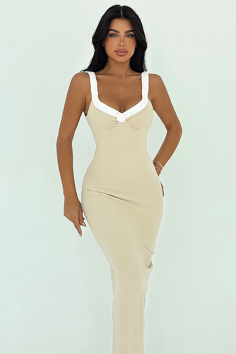 - Το φόρεμα έχει λεπτές τιράντες, εφαρμοστή γραμμή και σέξι λαιμόκοψη.
