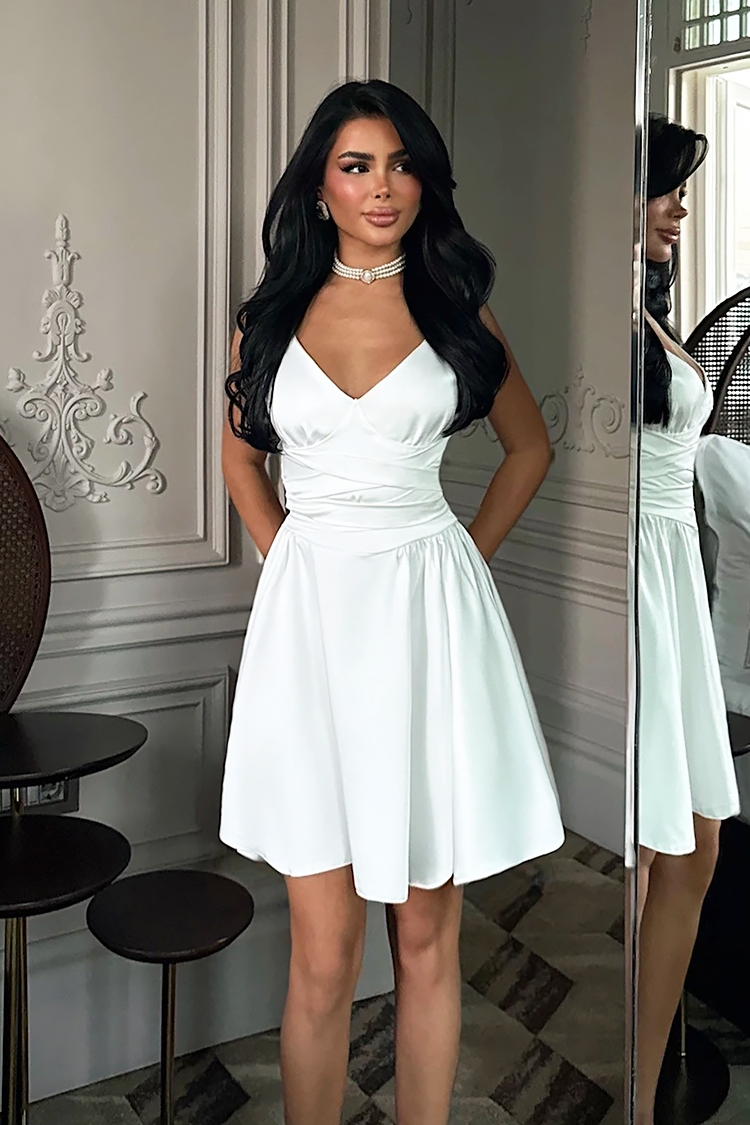 - Εντυπωσιακό κοντό φόρεμα σε λευκό χρώμα, κατάλληλο για καθημερινές και κομψές εμφανίσεις.