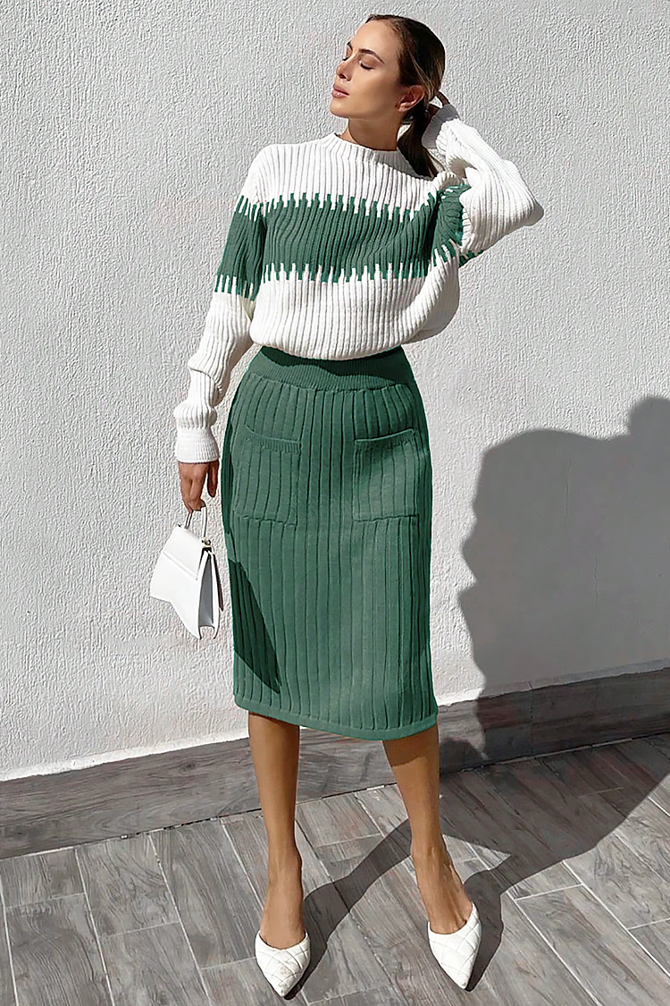 - Μοντέρνο σετ δύο τεμαχίων - άνετη φούστα και πουλόβερ με εντυπωσιακό σχεδιασμό.