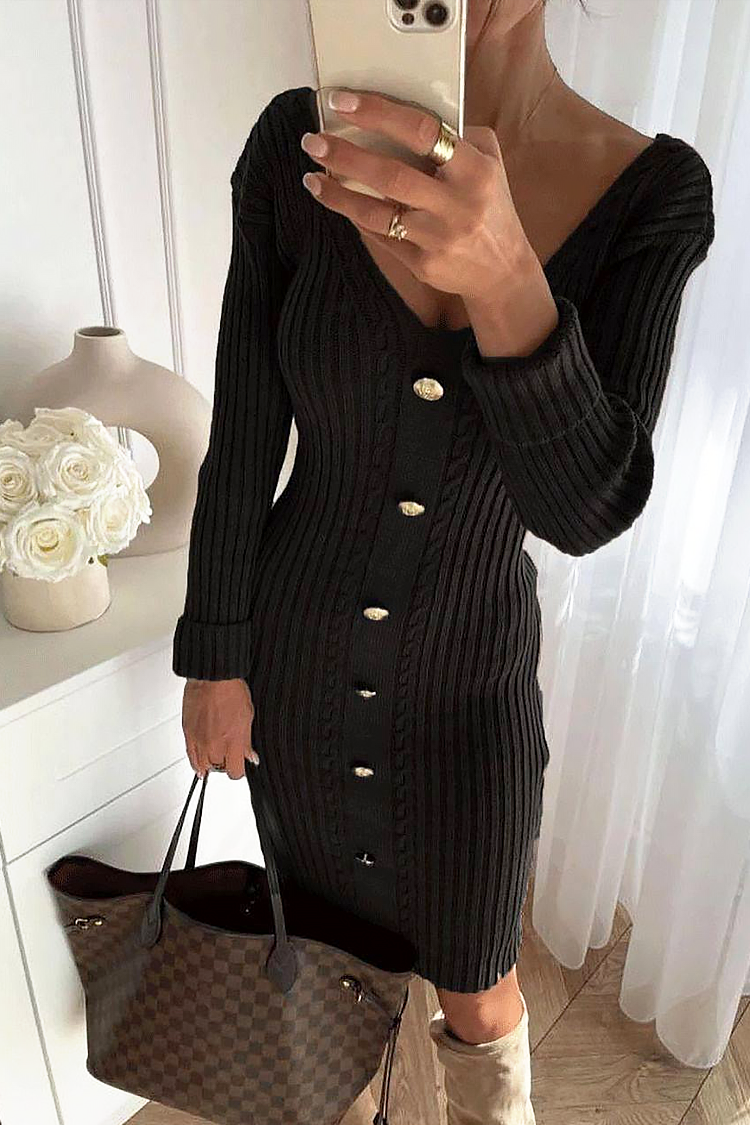 - Το φόρεμα είναι κοντό, με σέξι λαιμόκοψη και εντυπωσιακό σχέδιο με κουμπιά.