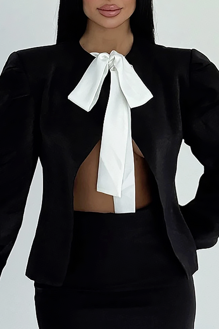 - Η μπλούζα έχει κομψό σχέδιο, μακριά μανίκια και διακοσμητική κορδέλα μπροστά, ενώ η φούστα έχει εφαρμοστή σέξι γραμμή.