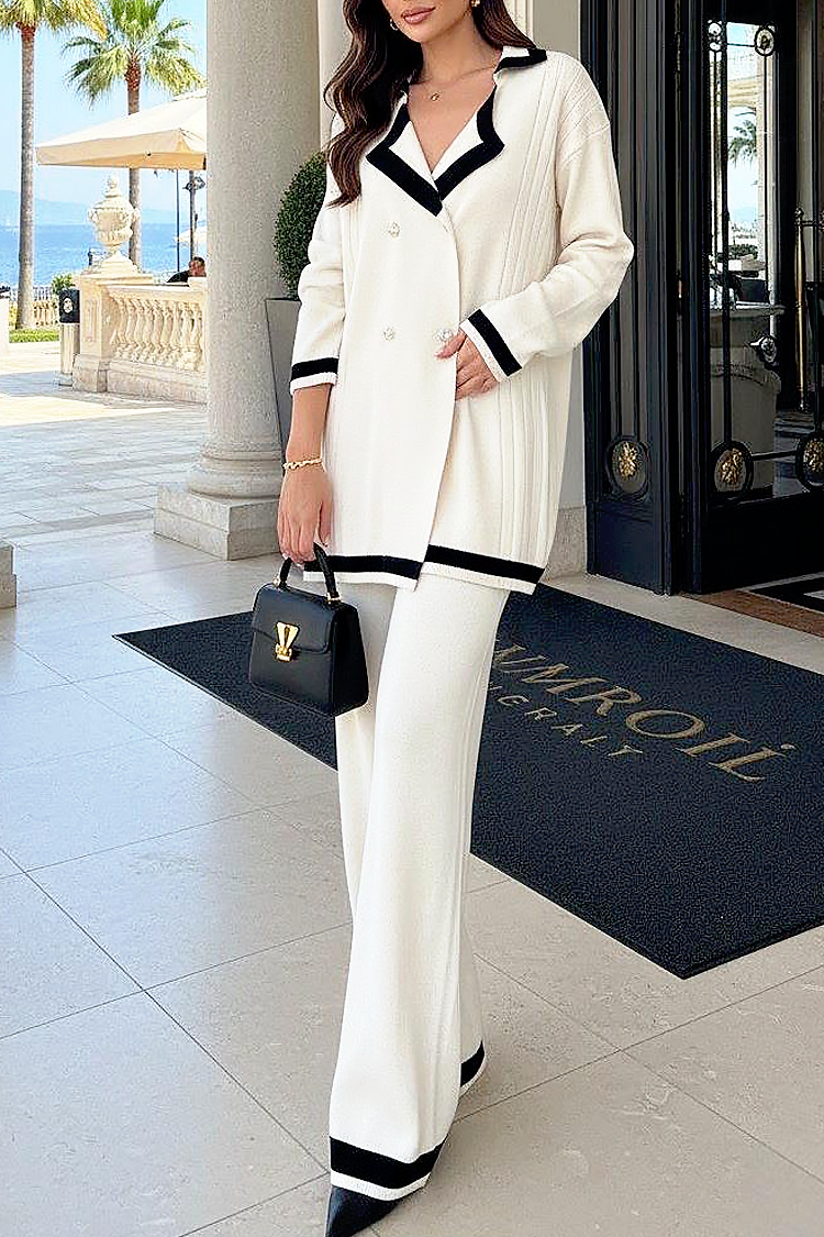 - Η ζακέτα έχει κομψή γραμμή, γιακά και εντυπωσιακά κουμπιά, ενώ το παντελόνι έχει φαρδιά γραμμή και ελαστική μέση.