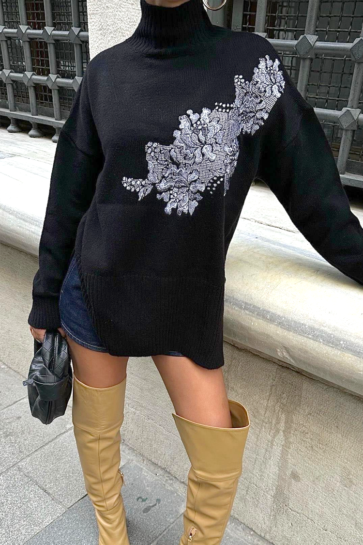 - Το μοντέλο έχει μακριά μανίκια, ψηλό γιακά και άνετη γραμμή.