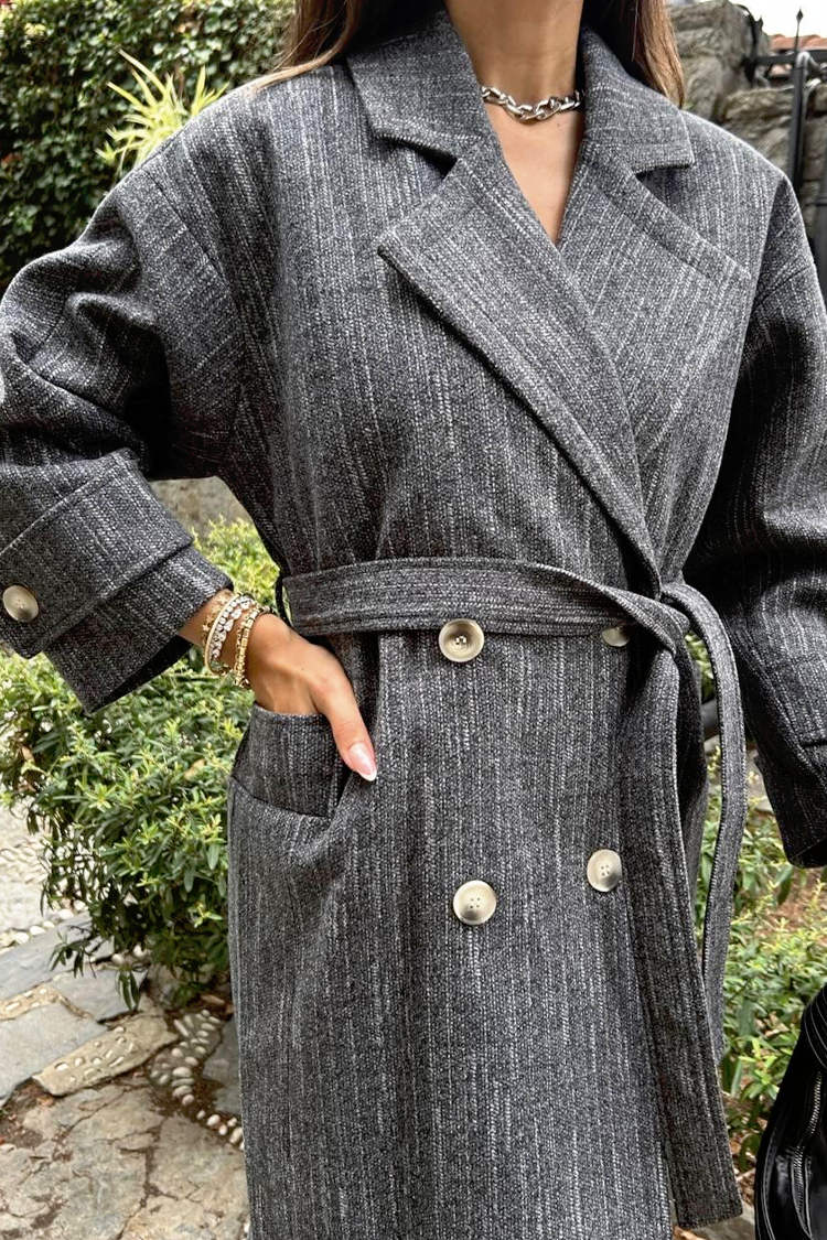 - Το μοντέλο έχει κλασική γραμμή, εντυπωσιακές μανσέτες, ζώνη από το ίδιο ύφασμα και διπλό κλείσιμο με κουμπιά.