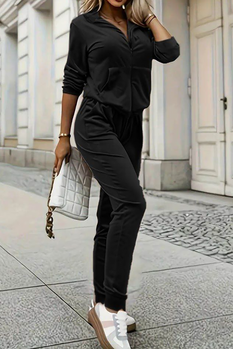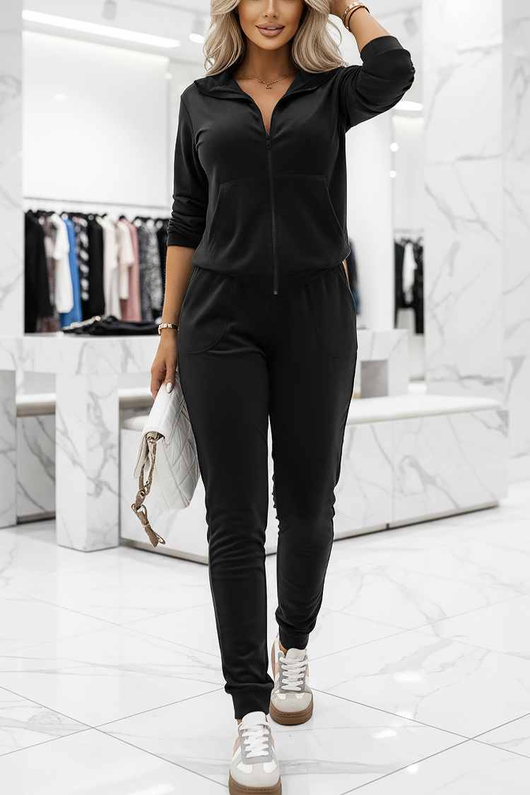 - Το σετ περιλαμβάνει άνετο παντελόνι με τσέπες και ψηλή μέση και φούτερ με κουκούλα και φερμουάρ.