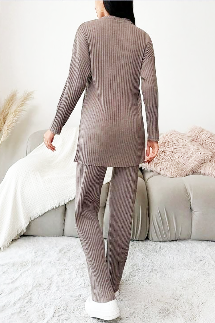 - Η μπλούζα έχει άνετη γραμμή και μακρύ μήκος, ενώ το παντελόνι έχει ψηλή μέση και φαρδιά μπατζάκια.