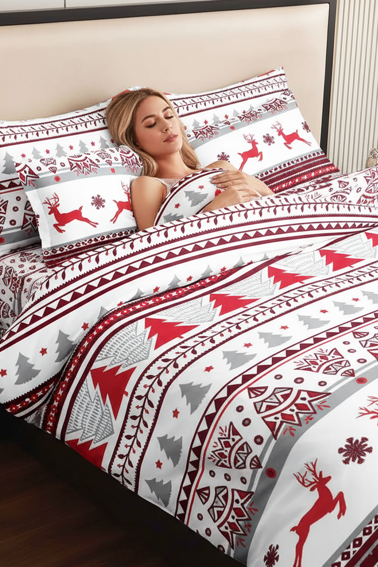 - Χριστουγεννιάτικο σετ κρεβατοκάμαρας τεσσάρων τεμαχίων με διαστάσεις 200x220 cm, κατασκευασμένο από υψηλής ποιότητας βαμβακερό σατέν.