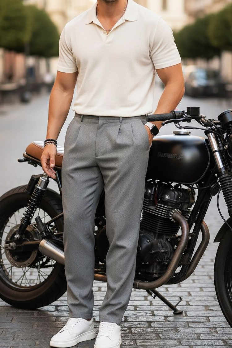 - Κομψό ανδρικό παντελόνι σε γκρι χρώμα με λιτό σχέδιο, τσέπες και ίσια μπατζάκια, με το οποίο θα τραβήξετε όλα τα βλέμματα.